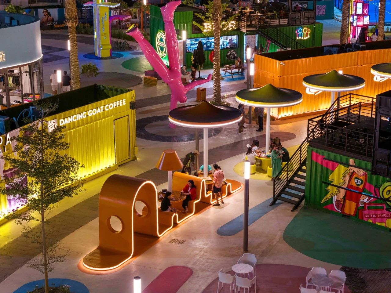 此外,設(shè)計(jì)團(tuán)隊(duì)提供了豐富多彩的娛樂項(xiàng)目,包括露天電影院、卡丁車、旱冰場、運(yùn)動(dòng)場、快閃市集、音樂會(huì)、工作坊等。餐飲和零售空間也是一大亮點(diǎn),均采用集裝箱式設(shè)計(jì)。這種模塊化的設(shè)計(jì)方法不僅提升了施工速度,還保持了一種引人注目的工業(yè)風(fēng)格。