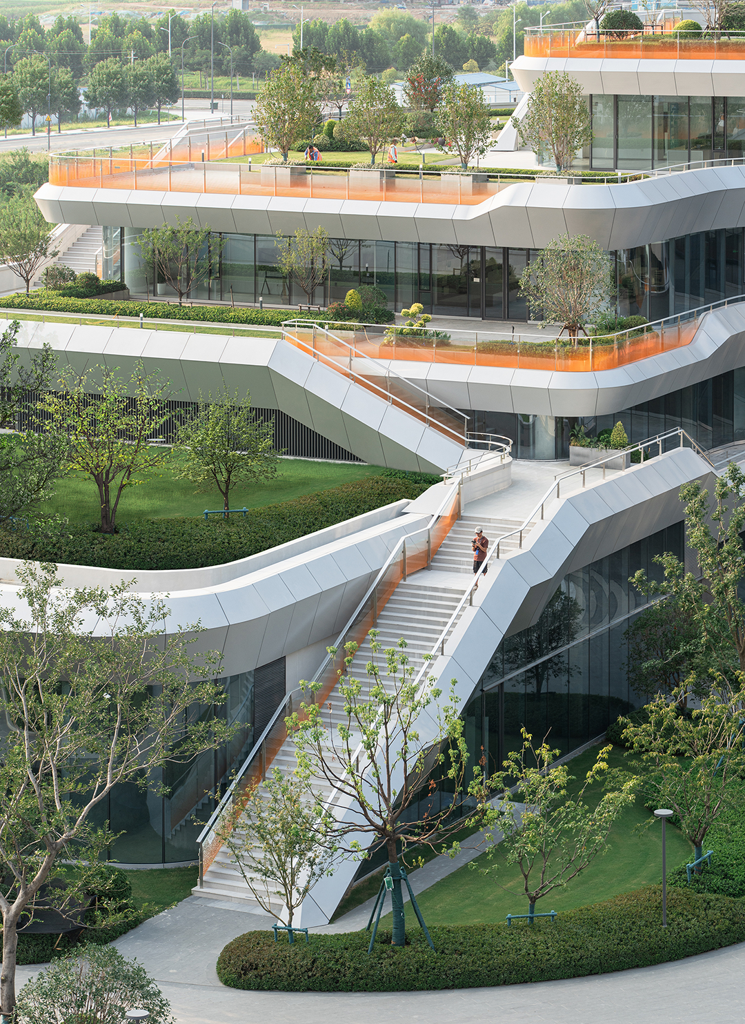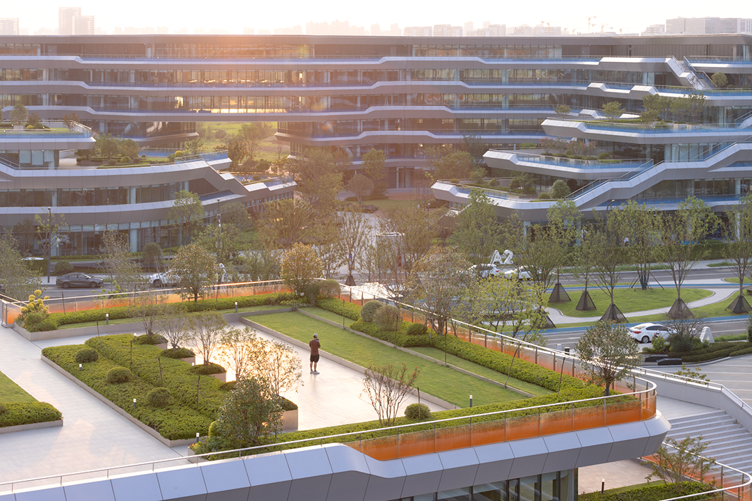 建筑采用流線型設(shè)計(jì),建筑組團(tuán)之間的開(kāi)敞空間提供了綠色可持續(xù)的公園式辦公環(huán)境。辦公區(qū)域的露臺(tái)、門(mén)廳、屋頂跑道、中軸生態(tài)廊道和景觀裝置,與園區(qū)外濱水花園和水岸步道共同組成了城市公共藝術(shù)公園,創(chuàng)造了在科技公司逛公園、看展覽的全新體驗(yàn)。此外,園區(qū)內(nèi)的景觀營(yíng)造不僅關(guān)注美學(xué)和功能性,還通過(guò)智能化技術(shù)應(yīng)用,實(shí)現(xiàn)景觀環(huán)境的動(dòng)態(tài)監(jiān)測(cè)和管理,包括智能照明、智能化感應(yīng)凈水系統(tǒng)、智能澆灌系統(tǒng)和智能溫控系統(tǒng)等。