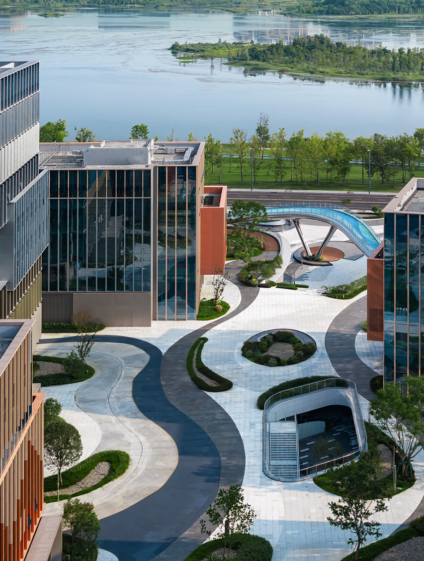 設計從成都的山川地貌中汲取靈感,結合規(guī)劃要求,提出了“蜀山綠谷”的布局概念。連續(xù)的綠色景觀和地景建筑貫穿南北,在中央構建出猶如川蜀江水靈動蜿蜒的“公共活力軸”,并保證了地塊之間的連接性。高層辦公樓位于地塊北側,多層辦公群圍繞活力軸線分布,商業(yè)空間則位于一層和地下。除此之外,設計打造了觀景連橋、藝展中心等“網(wǎng)紅打卡點”,并在南側市民廣場和中部下沉廣場創(chuàng)建了多個景觀節(jié)點,在綠水相映的環(huán)境中為園區(qū)使用者提供宜人閑適的辦公氛圍,構建公園城市示范區(qū)。在豐富的業(yè)態(tài)功能各自獨立運行的同時,又通過景觀和配套設施相連,促進社交與靈感碰撞,營造了工作、生活一體化的空間環(huán)境。