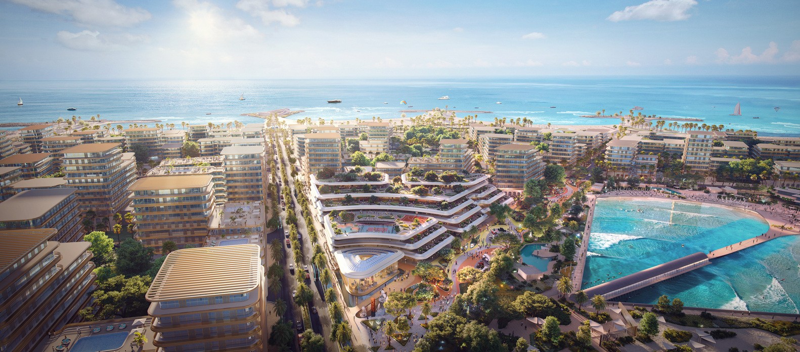 總體規(guī)劃圍繞貫穿海灘的海灘大道(Beach Drive)、主大道(Main Boulevard),以及連接兩者的Bilaj Al Jazayer大道這三條主軸展開。這些主要通道兩側(cè)種植了大量本土樹木,并設(shè)有步行道和自行車道,以鼓勵慢行交通。沿街建筑的底層設(shè)有商店、餐館和咖啡館,提供開闊的觀景視野,營造出充滿活力的公共空間。場地的中心是一處沖浪公園,采用最先進(jìn)的造浪技術(shù),可以在陸地上模擬自然海洋環(huán)境。與此同時,一片綠意盎然的公園綠地作為緩沖帶,將海岸與主干道分隔開來,在提供綠蔭的同時,保證了濱水活動空間的安全。一系列碼頭延伸至大海中,帶來了豐富的景觀游覽體驗(yàn)。