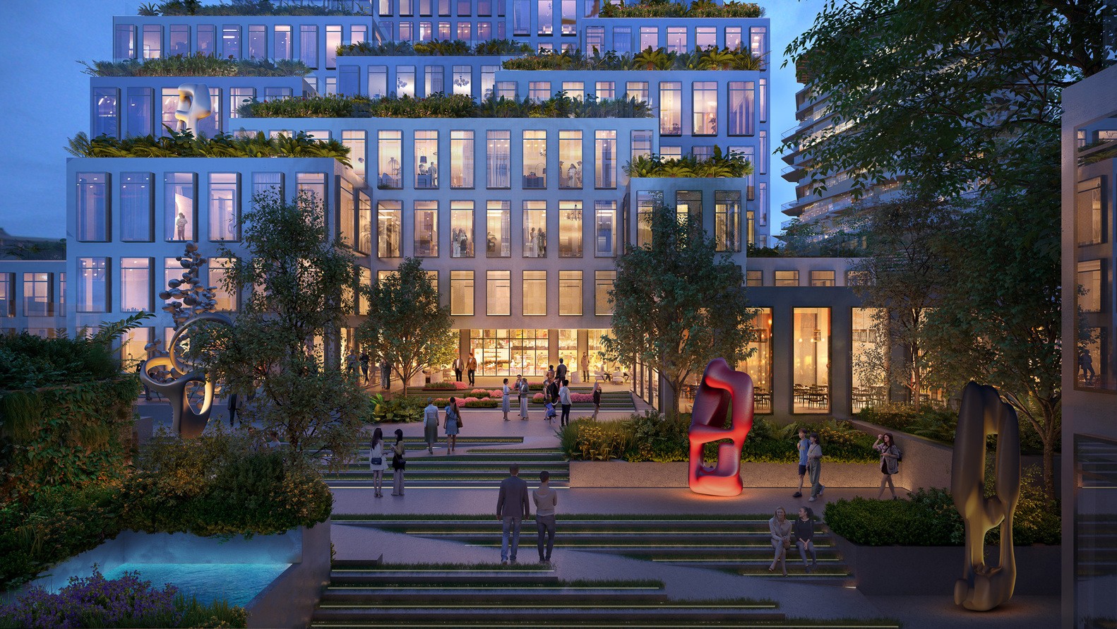 場地中的兩棟建筑內(nèi)設(shè)有辦公、豪華酒店及休閑空間。建筑相連的部分仿照自然峽谷地形,匯聚了宴會廳、會議室、酒吧、餐廳、零售、藝術(shù)空間和露臺等重要功能場所,并通過自動扶梯網(wǎng)絡(luò),實現(xiàn)了功能場所之間的無縫銜接。受杭州代表性丘陵景觀的啟發(fā),設(shè)計將自然元素貫穿整個項目。一系列層層疊疊的階梯式設(shè)計與“城市峽谷”的三維景觀相契合,也為新世界集團的藝術(shù)和雕塑收藏提供了展示舞臺。交織的露臺和屋頂綠地為兩座建筑體增添獨特的景觀環(huán)境,并提供高空賞景之處,酒店顧客、辦公人員和游客可以自由進入場地中的雕塑花園,獲得豐富的文化體驗。