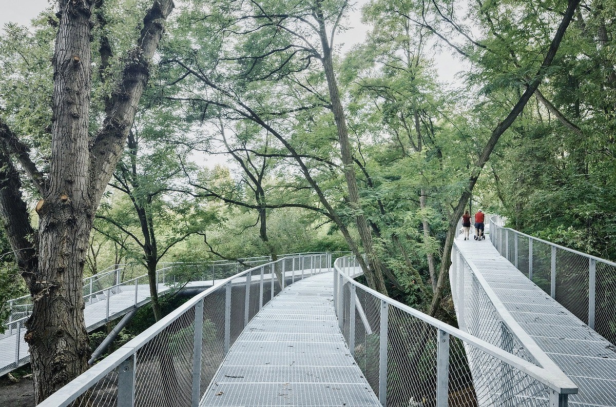 設(shè)計旨在梳理場地,保留歷史記憶,并為附近新建住宅區(qū)的居民們提供休閑空間。由于地形復(fù)雜,設(shè)計進(jìn)行了土方平衡等處理,引入人行天橋和人工峽谷以增加可達(dá)性,并創(chuàng)建眾多休息區(qū)和自然游樂場等活動區(qū)來滿足居民的日常游憩需求。為了豐富場地的生物多樣性,設(shè)計團(tuán)隊觀察了先鋒物種和入侵物種的自然演替過程,進(jìn)一步模擬它們發(fā)展趨勢的同時,補充大量本土植物。此外,設(shè)計保留了場地原有土壤和地表水徑流來支持土壤自然沉淀的過程,并引入木制排水溝和排水槽等“微保留”手段,收集碎石混凝土制成擋土墻和景觀雕塑。