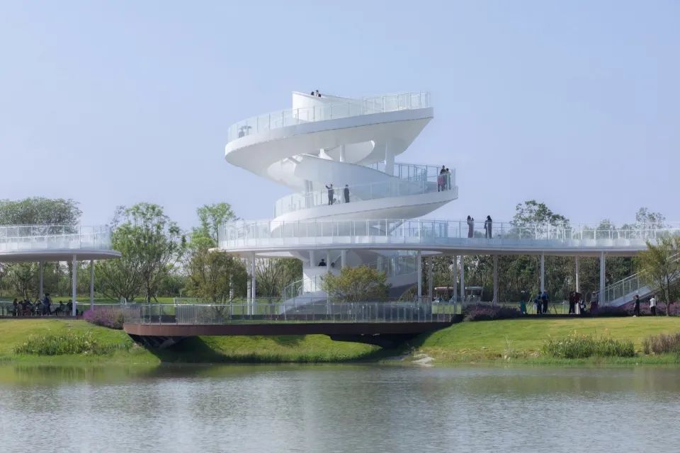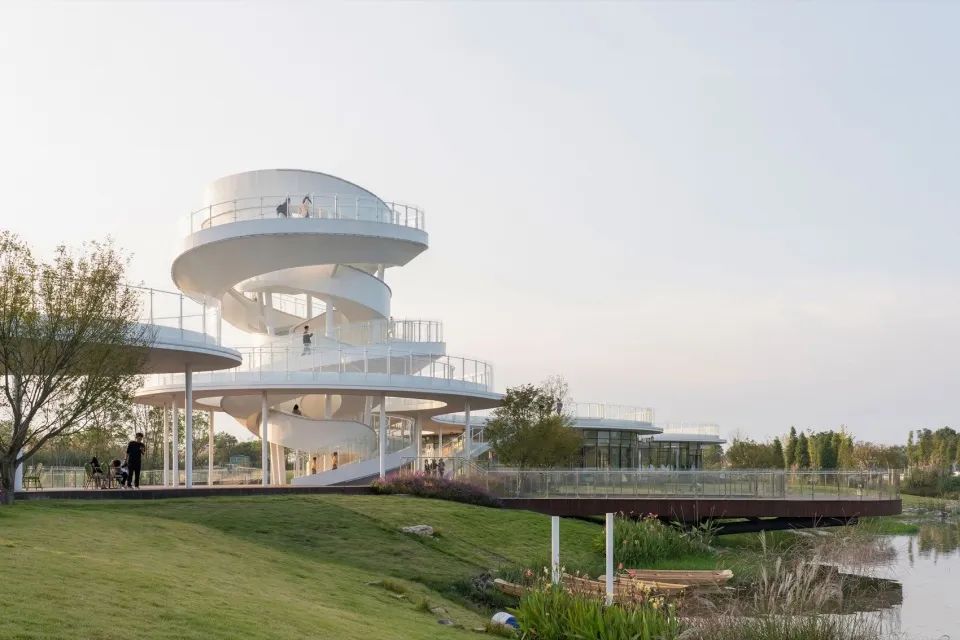 設(shè)計(jì)從金馬河的河道肌理汲取靈感,將建筑形態(tài)設(shè)計(jì)為充滿流動(dòng)與韻律的自然曲線形式。建筑的水平屋頂由白色金屬鋼板包裹,建筑立面則采用通透玻璃材質(zhì),呈現(xiàn)出建筑“漂浮于水面”、仿佛融入濕地自然場景之中的視覺效果。同時(shí),建筑通過流線型道路串聯(lián)起不同功能區(qū)塊,讓游客能夠自由穿梭其間,體驗(yàn)“游園”般的空間趣味與探索感。建筑設(shè)有可供公眾活動(dòng)的屋頂及廊架平臺(tái),并與木棧道相連。棧道的一側(cè)向水面延伸,形成親水懸挑平臺(tái),為游客提供了親近自然的機(jī)會(huì);另一側(cè)連接金馬河綠道,成為場地與濕地公園的紐帶。