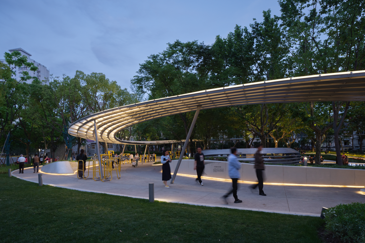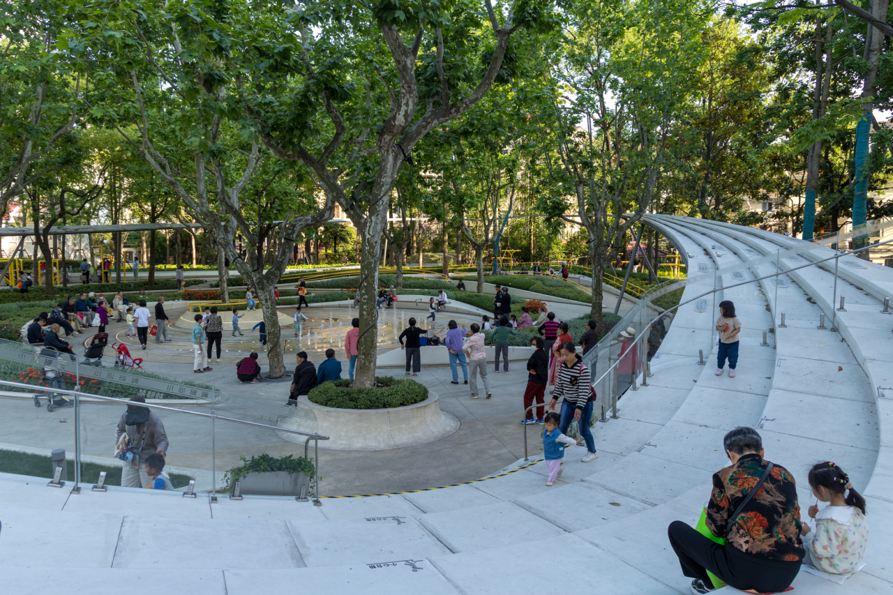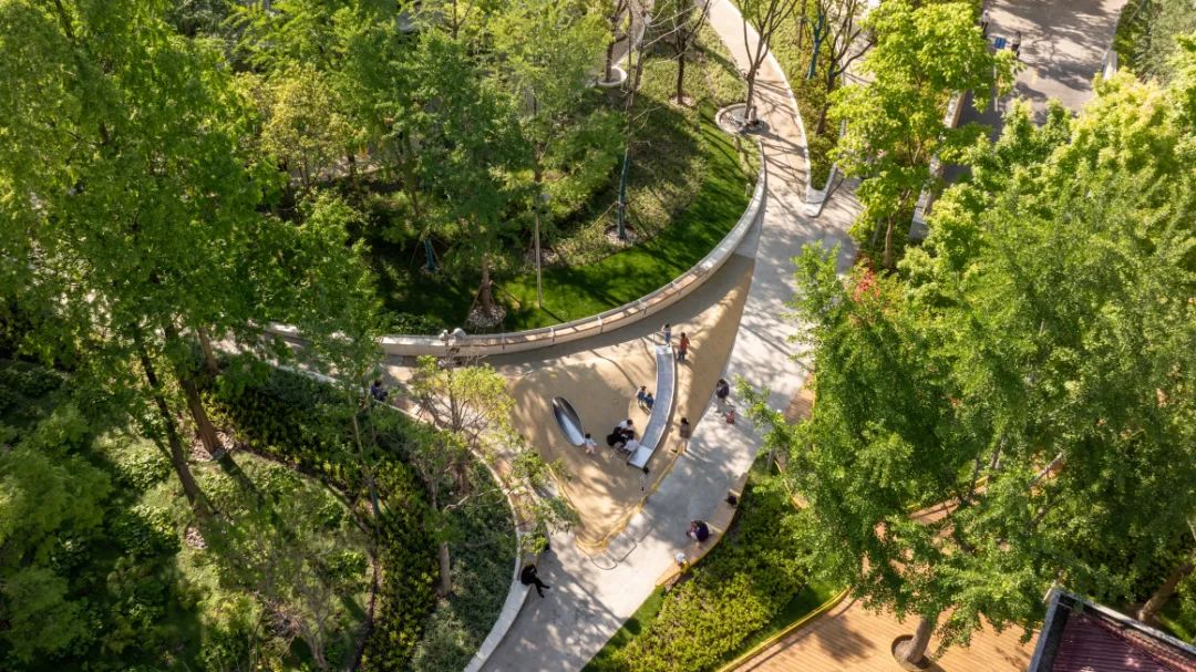 本次更新設(shè)計試圖打造更為通透舒適的自然花園體系,使原本封閉的公園空間重新開放起來。設(shè)計采取了“小中做大”的策略,將社區(qū)功能融入這片林下花園之中。設(shè)計保留了場地原有的濃密樹林,設(shè)置了高低起伏的微地形和坡道,并努力確保新增園路避開樹木下盤結(jié)交錯的樹根。全園的無障礙設(shè)計從公園入口延續(xù)至內(nèi)部花園各處,既順應(yīng)了場地的豎向高差,又讓居民的步行路線更加通暢安全。此外,設(shè)計置入了螺旋漫步道、活動廣場、“光合之環(huán)”廊架、戲水音樂噴泉等景觀節(jié)點,結(jié)合健身器材、休憩臺階、公交停靠站臺等設(shè)施,在有限的綠地中創(chuàng)造更多休憩停留的空間。