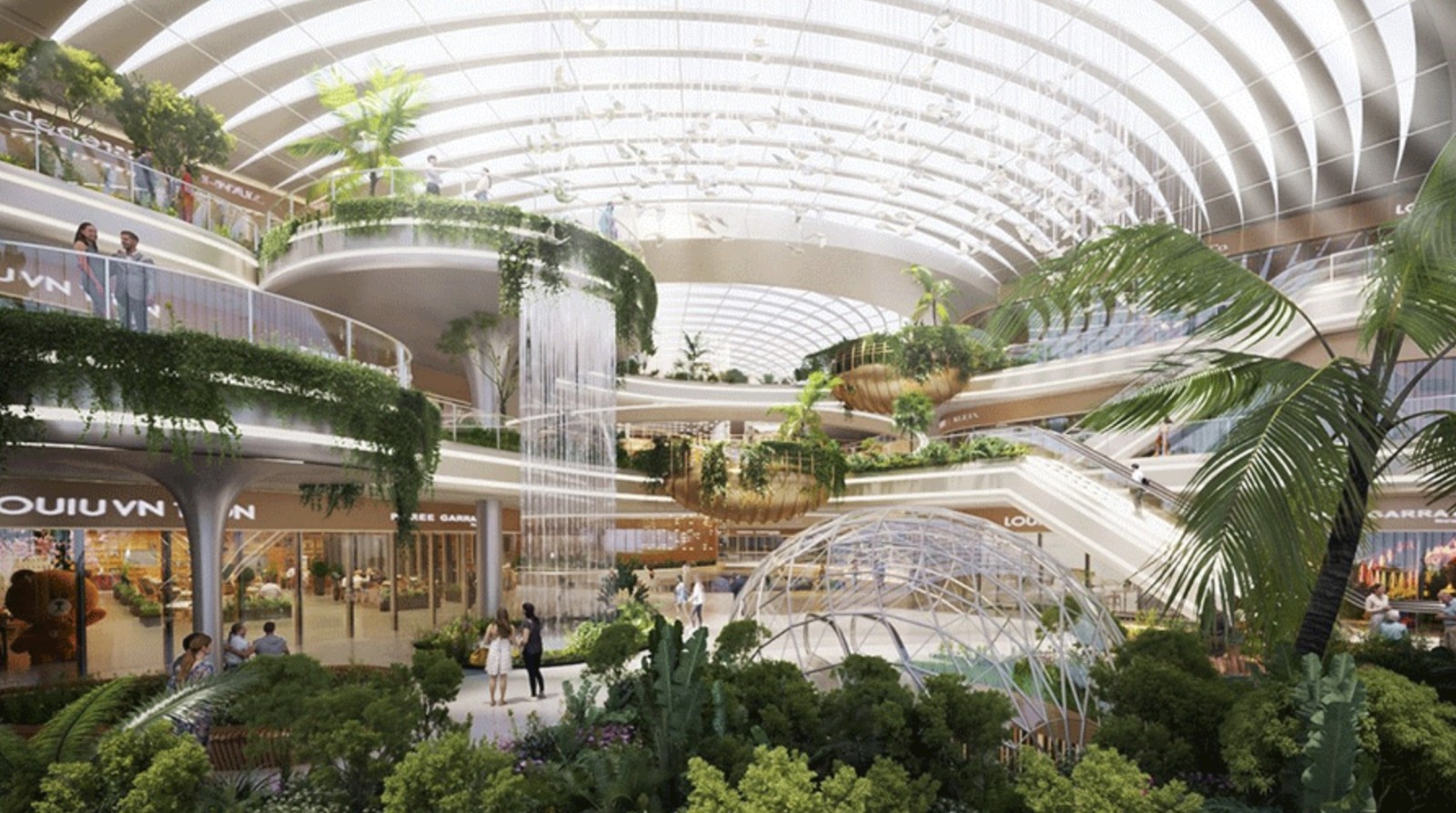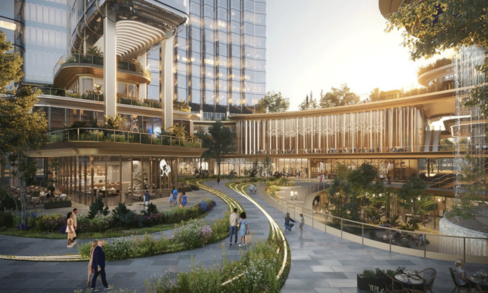 設計對場地采取“動靜分區(qū)”的策略,將酒店所在的兩棟塔樓布局在西側,在東側則設置了商業(yè)分區(qū),便于吸引人流促進片區(qū)繁榮。建筑塔樓與裙房形成的圍合空間,被精心設計成了一個中央生態(tài)花園,將自然景觀延伸進建筑視野。通過合理規(guī)劃場地動線,設計在建筑的多層退臺塑造“流水飛瀑”、綠植層臺等景觀,并將其與建筑外部的城市公園連接,塑造城市公園景觀一體化,有效消弱了建筑與自然景觀的邊界。