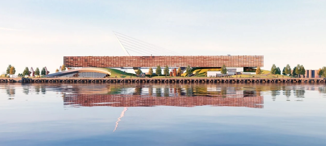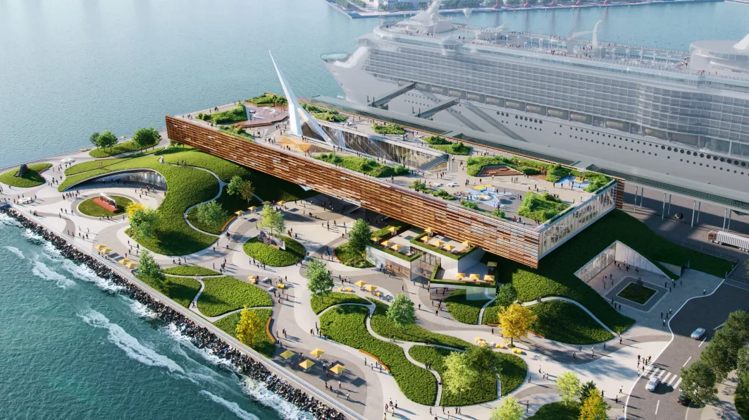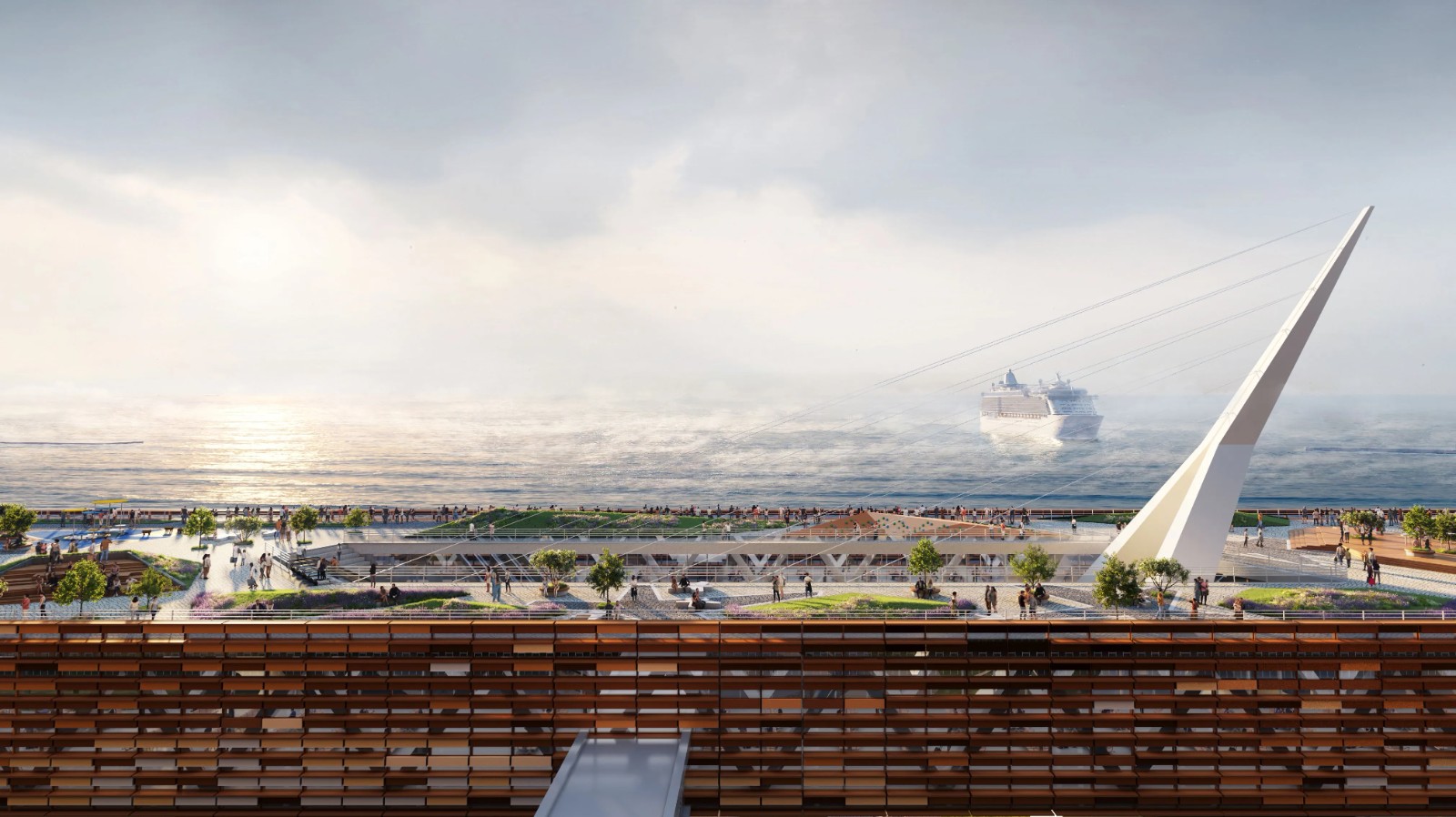 本次評選一等獎由中國新興建筑工程有限責任公司獲得。該方案的設計理念是結合親近自然的生態(tài)公園和公共開放的觀海平臺,建設一個功能復合的通關大廳。設計將建筑綜合體抬高,形成地標性城市門戶,同時將綜合體底層設計為利于登船的高度。設計用“綠毯”包裹住公共空間,使其盡可能地與城市自然相銜接,形成能有更多互動可能性的大地景觀公園。游客可以通過全天面向公共開放的路徑到達屋頂花園,人們無需登船也能在360°觀海平臺上體驗獨特的風景。