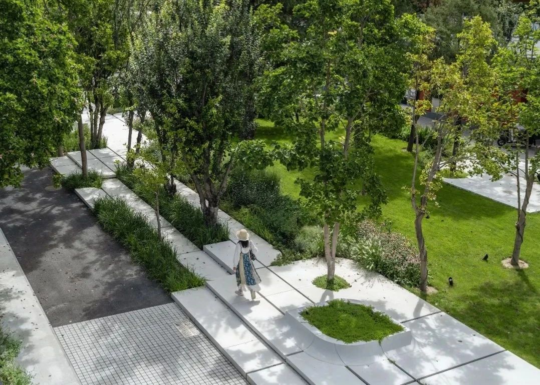 作為使館區(qū)核心位置極為稀缺的開放空間,設(shè)計(jì)保留了園區(qū)內(nèi)茂密的玉蘭、銀杏和海棠樹林,以“花園庭院”為主題,將自然與藝術(shù)融入辦公園區(qū),打造具有人文精神的“花園綠芯”。設(shè)計(jì)將公共空間劃分為6個(gè)各具特色的花園廣場(chǎng),并用5條綠色步行廊道和3處沿街步行空間相連接。設(shè)計(jì)引入"玉蘭花瓣"造型的白色預(yù)制混凝土砌塊作為鋪裝場(chǎng)地,創(chuàng)造各式各樣的“花瓣”汀步造型,既可靈活避讓現(xiàn)有的喬木和井蓋,又營(yíng)造出了輕松活潑的景觀氛圍。中央草坪區(qū)可容納80人的戶外瑜伽、野餐露營(yíng)、周末市集和派對(duì)活動(dòng)等,以滿足居民的日常需求。