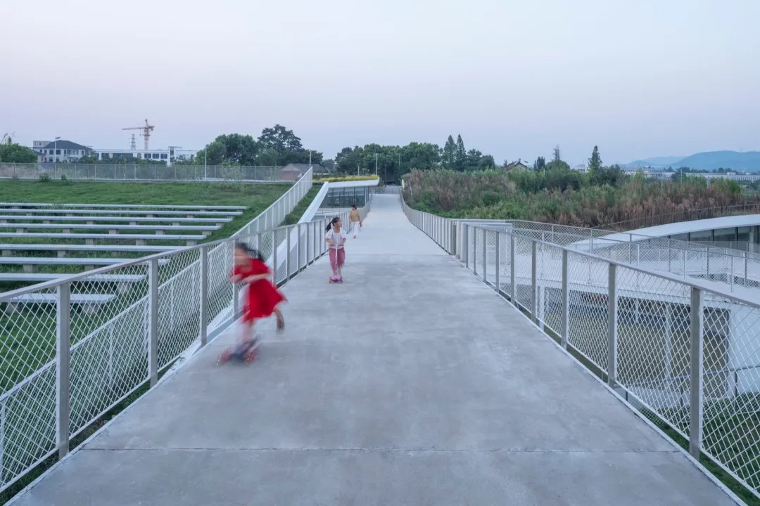 設計團隊對建筑采用了彈性設計——不同大小的展廳分散布置在起伏的場地中,以廊連接。展覽、辦公、教育、商店、茶室等空間通過場地布局可以自由組合,分別展示不同的內容,供不同的人群進行創(chuàng)意辦公,也可以圍繞時令主題開展各種文化共享活動。廊院空間借助地形提升連通性,人們可以在高低錯落的廊架下面或頂棚上自由穿行,仿佛仍置身于田野之中。