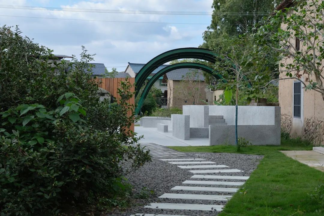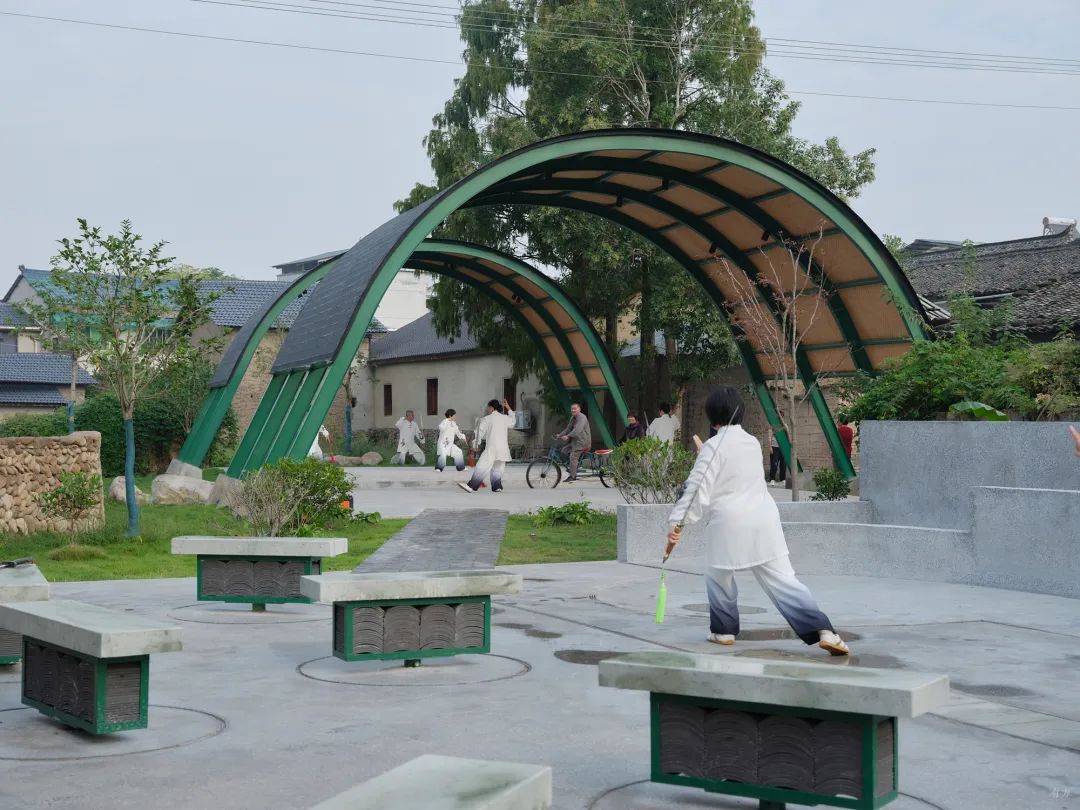 設(shè)計通過入口拱棚廣場、中心活動廣場和半圓形茶樹廣場的布局,營造出從“動”到“靜”的漸進式空間體驗。入口拱棚廣場位于村路兩側(cè),與社區(qū)中心相鄰,是可承載大型活動的開放公共場地。一條蜿蜒小路穿過北側(cè)綠地,連接社區(qū)中心與廣場,為老街與廣場之間提供便捷的通行路徑。位于中心的活動廣場通過雨棚、座椅、棋桌等設(shè)施,以及輕微起伏的地形,為居民的日常活動和社群活動提供多樣可能。盡端的茶樹廣場圍繞兩棵百年古茶樹而設(shè),營造出一個寧靜的休憩空間。