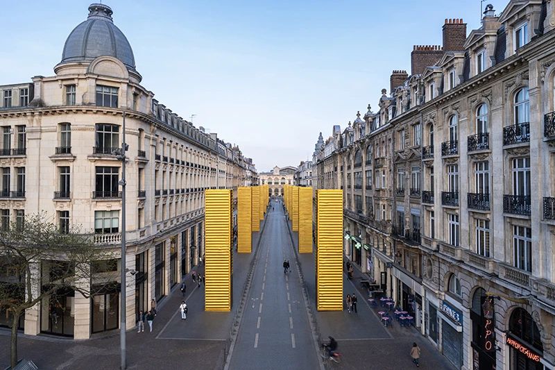 日前,西班牙城市藝術(shù)家SpY的最新公共藝術(shù)裝置“鍍金方碑”(Golden Monoliths)在法國里爾市中心驚艷亮相。14個(gè)經(jīng)過鍍金處理的集裝箱被垂直豎立,沿城市主干道莊嚴(yán)排列,將這條日常通道轉(zhuǎn)變?yōu)槌錆M儀式感的藝術(shù)長廊。這些閃耀著金屬光澤的工業(yè)構(gòu)件徹底擺脫了原有的實(shí)用功能,蛻變?yōu)闃O具視覺沖擊力的“城市圖騰”。