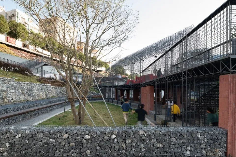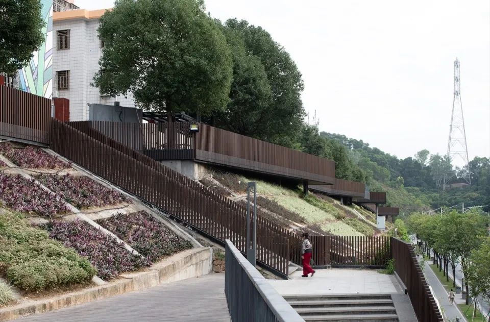 項目結(jié)合涼帽村的高臺地形特點,設計了“兩個基礎設施組團+T字形街道組團”的空間格局:以街道連接兩個基礎設計組團和若干街心花園、臺地花園等景觀空間,挖掘涼帽村現(xiàn)有公共景觀的潛力,力圖以較少的介入創(chuàng)造出更優(yōu)質(zhì)、更充足的公共活動場所。村址公園與社區(qū)樂園構(gòu)成了兩個基礎設施組團。在村址公園的首層,設計以景觀庭院的方式還原老村建筑肌理,二層則新建鋼結(jié)構(gòu)連廊,將老村、新村與涼帽山自然步道相連,增強區(qū)域整體性與可達性。在社區(qū)樂園,設計通過垂直空間的設計,置入開放式劇場、籃球場、兒童游樂設施等,賦予場地更多活力和包容性,實現(xiàn)全齡段友好。