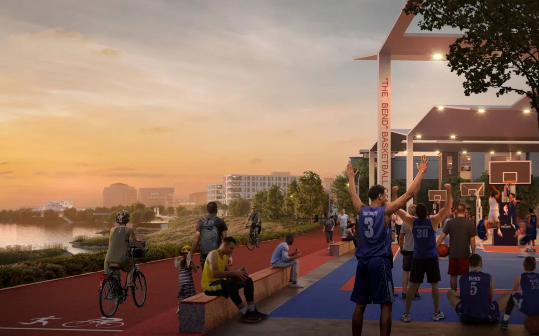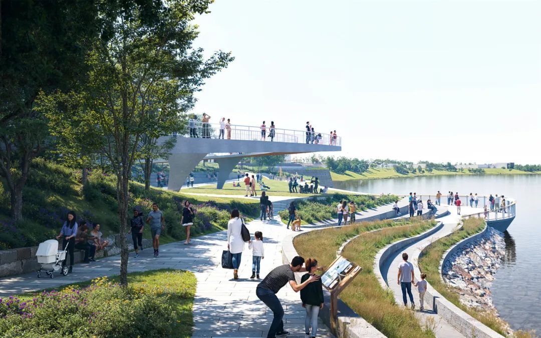 設計采取了“擁抱河流”(Embrace the River)、“縫合城市”(Stitch the City)和“從主街出發(fā)”(Main Street and More)三大設計策略,并將大彎公園設為區(qū)域發(fā)展核心。設計改善了市中心與周邊社區(qū)之間的出行通道,實現(xiàn)更安全、便捷、舒適的交通聯(lián)系。主街全長約800m,餐廳、商店、文化與市政機構、娛樂場所等皆匯集于此。此外,設計打造了“河灣之道”——這是一條多功能的標志性步道,既是重要的防洪基礎設施,也是供行人、跑步者和騎行者使用的體驗路徑。由于場地存在高差,設計通過“河灣之道”巧妙地串聯(lián)了多個節(jié)點,提高了濱水公共空間的連通性。