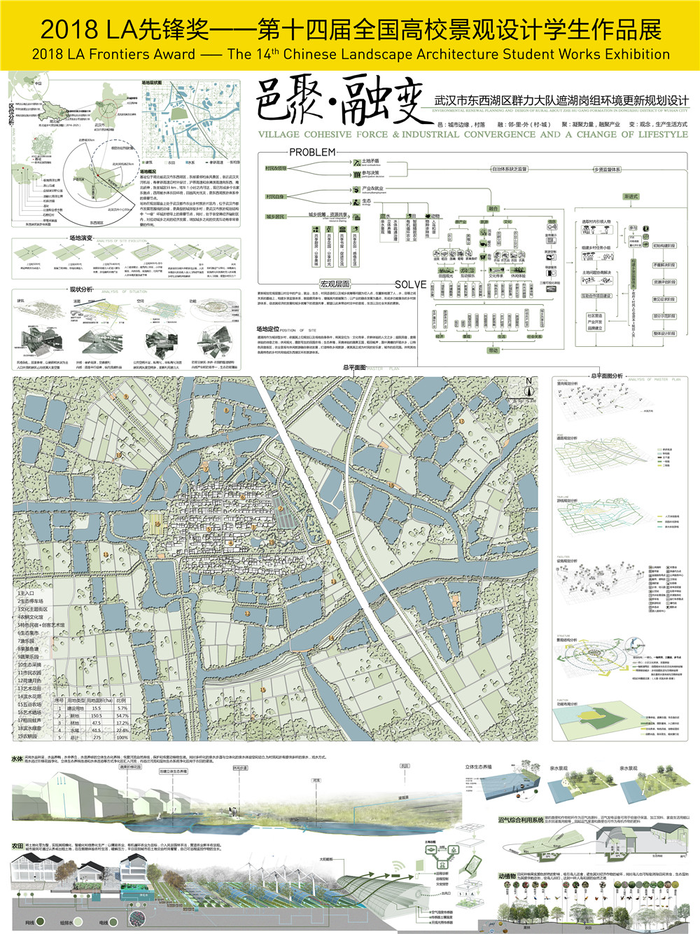 宏觀層面上,從土地矛盾和參與決策缺失、產業(yè)就業(yè)和鄉(xiāng)村生態(tài)、城鄉(xiāng)統(tǒng)籌發(fā)展和資源共享等問題出發(fā),提出產業(yè)融合發(fā)展和漸進式的規(guī)劃框架;通過生物多樣性保護、有機智能農業(yè)建設、水體治理和生態(tài)養(yǎng)殖等重新構建人與自然相和諧的關系;遵循村莊、水體、農田三個圈層的場地肌理,進行場地總平面的規(guī)劃和規(guī)劃分析。