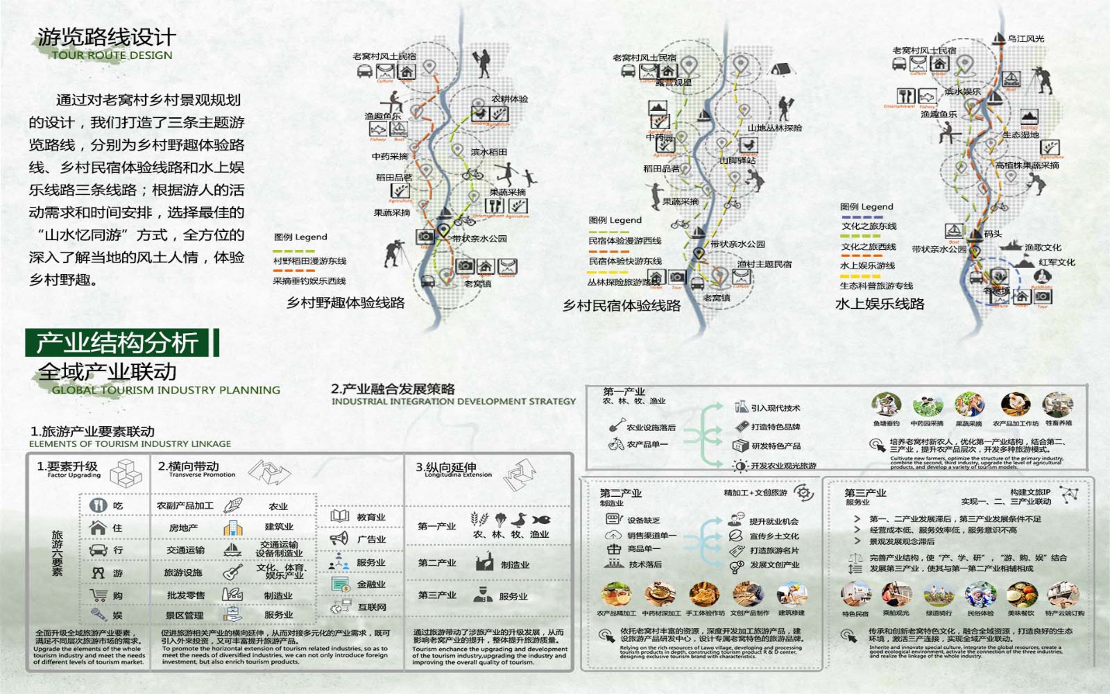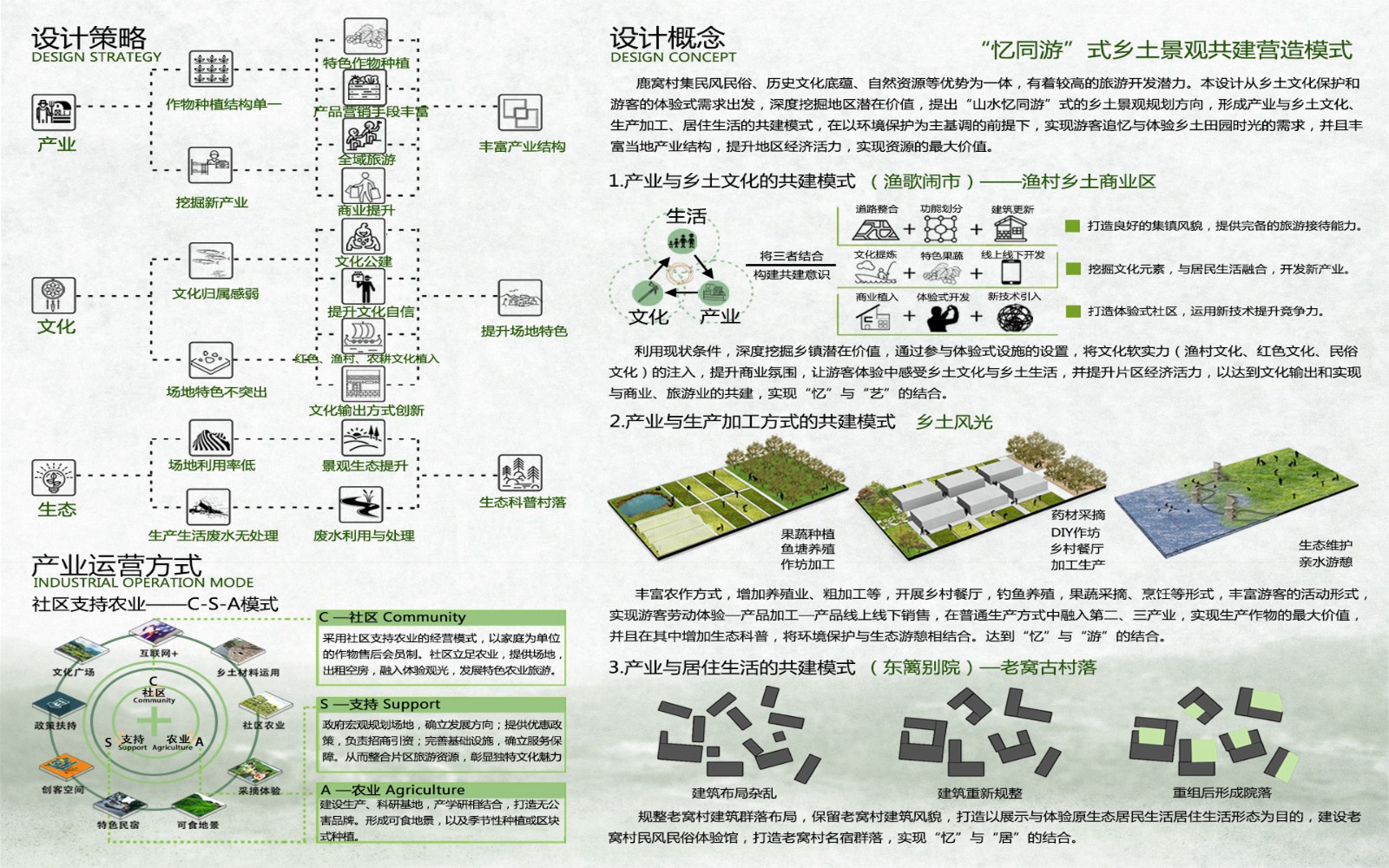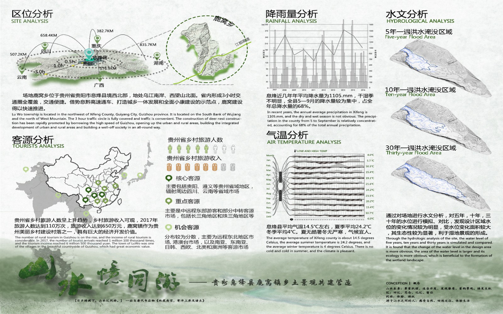 項目簡介:本次設計作品位于中國貴州息烽縣鹿窩鎮(zhèn),鹿窩鎮(zhèn)因交通閉塞、對外交流較弱等原因,保持著完好的鄉(xiāng)土景觀風貌和淳樸的民俗民風;鹿窩鎮(zhèn)有著豐富的自然資源、文化底蘊和風土風貌,本次主題以深度挖掘其價值,將山水作為依托,提出鄉(xiāng)土景觀共建概念;將“山水憶同游”融入到產(chǎn)業(yè)、生活、生產(chǎn)方式等各個方面,實現(xiàn)游客體驗參與的目的,并且豐富產(chǎn)業(yè)結構。本次設計概念提出產(chǎn)業(yè)與鄉(xiāng)土文化、生存加工方式、居住生活的共建模式;利用現(xiàn)狀條件,挖掘鄉(xiāng)鎮(zhèn)的潛在價值,放大體驗式景觀的重要性,將文化軟實力(漁村文化、紅色文化、民俗文化)等通過現(xiàn)代技術和參與式體驗的方式注入到產(chǎn)業(yè)中,并且在原有的生產(chǎn)加工方式上,提出鄉(xiāng)村景觀營造、游客勞作體驗、生產(chǎn)加工產(chǎn)業(yè)鏈構建等,達到新興產(chǎn)業(yè)的蓬勃興起。并且保留了老窩村的建筑風貌,重新規(guī)整與組合,形成獨具提色的老窩村民風民俗體驗館,打造名宿群落,最大程度的實現(xiàn)“憶同游”的宗旨,實現(xiàn)游客追憶與體驗鄉(xiāng)土田園時光的需求,并且在以環(huán)境保護,保護本土風貌的主基調(diào)下,豐富當?shù)禺a(chǎn)業(yè)結構,提升地區(qū)經(jīng)濟活力,實現(xiàn)資源的最大價值。