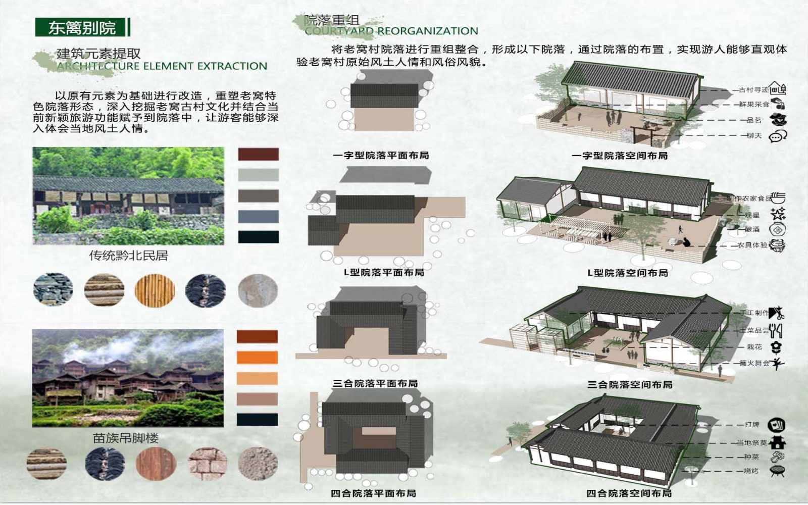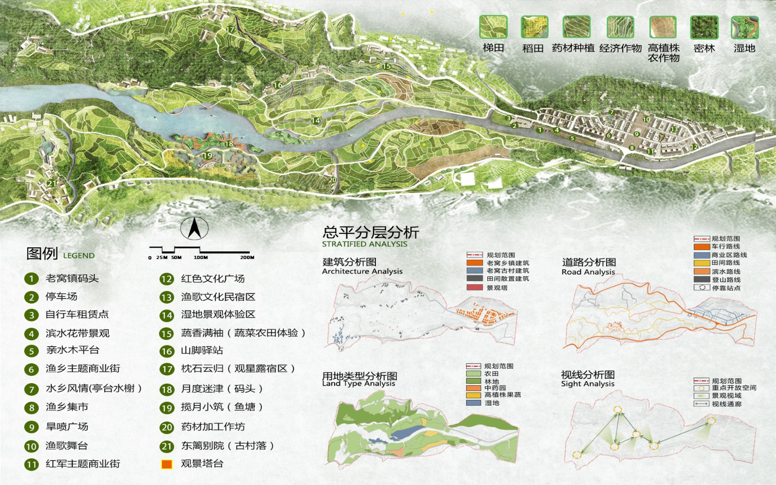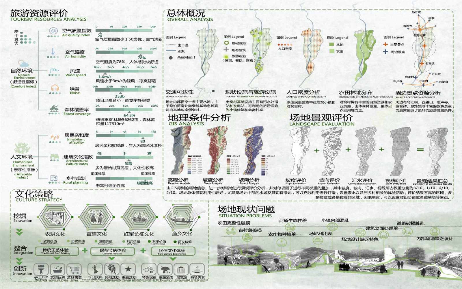 項目簡介:本次設計作品位于中國貴州息烽縣鹿窩鎮(zhèn),鹿窩鎮(zhèn)因交通閉塞、對外交流較弱等原因,保持著完好的鄉(xiāng)土景觀風貌和淳樸的民俗民風;鹿窩鎮(zhèn)有著豐富的自然資源、文化底蘊和風土風貌,本次主題以深度挖掘其價值,將山水作為依托,提出鄉(xiāng)土景觀共建概念;將“山水憶同游”融入到產(chǎn)業(yè)、生活、生產(chǎn)方式等各個方面,實現(xiàn)游客體驗參與的目的,并且豐富產(chǎn)業(yè)結構。本次設計概念提出產(chǎn)業(yè)與鄉(xiāng)土文化、生存加工方式、居住生活的共建模式;利用現(xiàn)狀條件,挖掘鄉(xiāng)鎮(zhèn)的潛在價值,放大體驗式景觀的重要性,將文化軟實力(漁村文化、紅色文化、民俗文化)等通過現(xiàn)代技術和參與式體驗的方式注入到產(chǎn)業(yè)中,并且在原有的生產(chǎn)加工方式上,提出鄉(xiāng)村景觀營造、游客勞作體驗、生產(chǎn)加工產(chǎn)業(yè)鏈構建等,達到新興產(chǎn)業(yè)的蓬勃興起。并且保留了老窩村的建筑風貌,重新規(guī)整與組合,形成獨具提色的老窩村民風民俗體驗館,打造名宿群落,最大程度的實現(xiàn)“憶同游”的宗旨,實現(xiàn)游客追憶與體驗鄉(xiāng)土田園時光的需求,并且在以環(huán)境保護,保護本土風貌的主基調(diào)下,豐富當?shù)禺a(chǎn)業(yè)結構,提升地區(qū)經(jīng)濟活力,實現(xiàn)資源的最大價值。