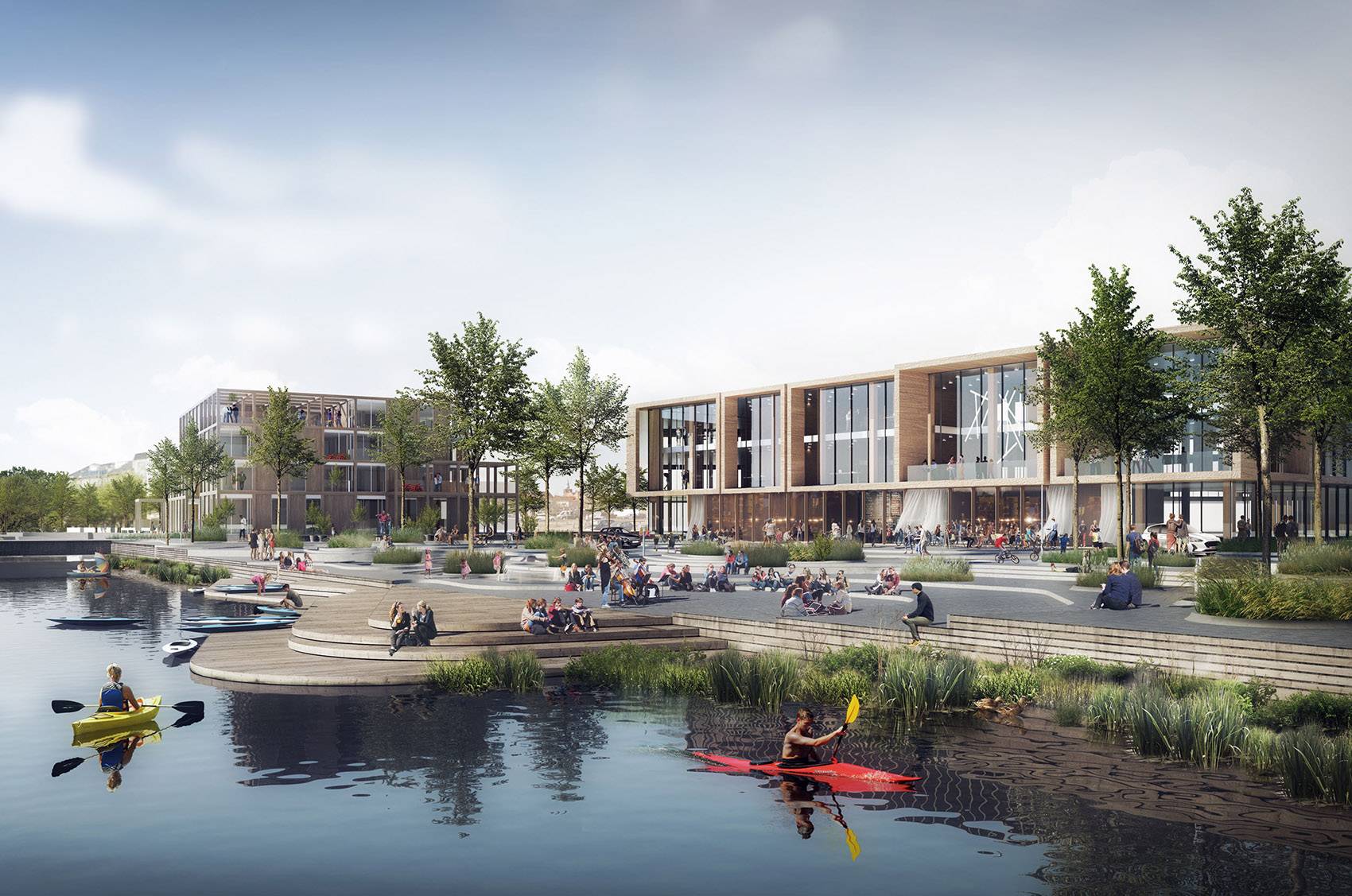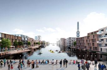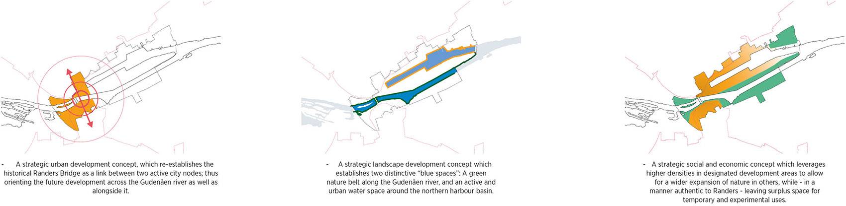 本獲獎(jiǎng)方案通過創(chuàng)建兩個(gè)不同的“藍(lán)色”空間來激活新的城市街區(qū)。具體來說,方案一方面沿著Guden?河流打造了一個(gè)極具自然氣息的空間,另一方面圍繞著位于城市北部可作為休閑場所和雨水蓄水池的港池打造了一個(gè)“城市中的水體空間”。憑借著這兩個(gè)獨(dú)特的水系空間,蘭德斯不僅在市中心地帶創(chuàng)造出一系列全新的自然和文化體驗(yàn),更重新建立起城市與Guden?河流之間的聯(lián)系。