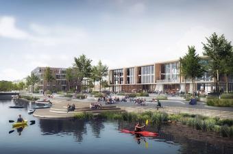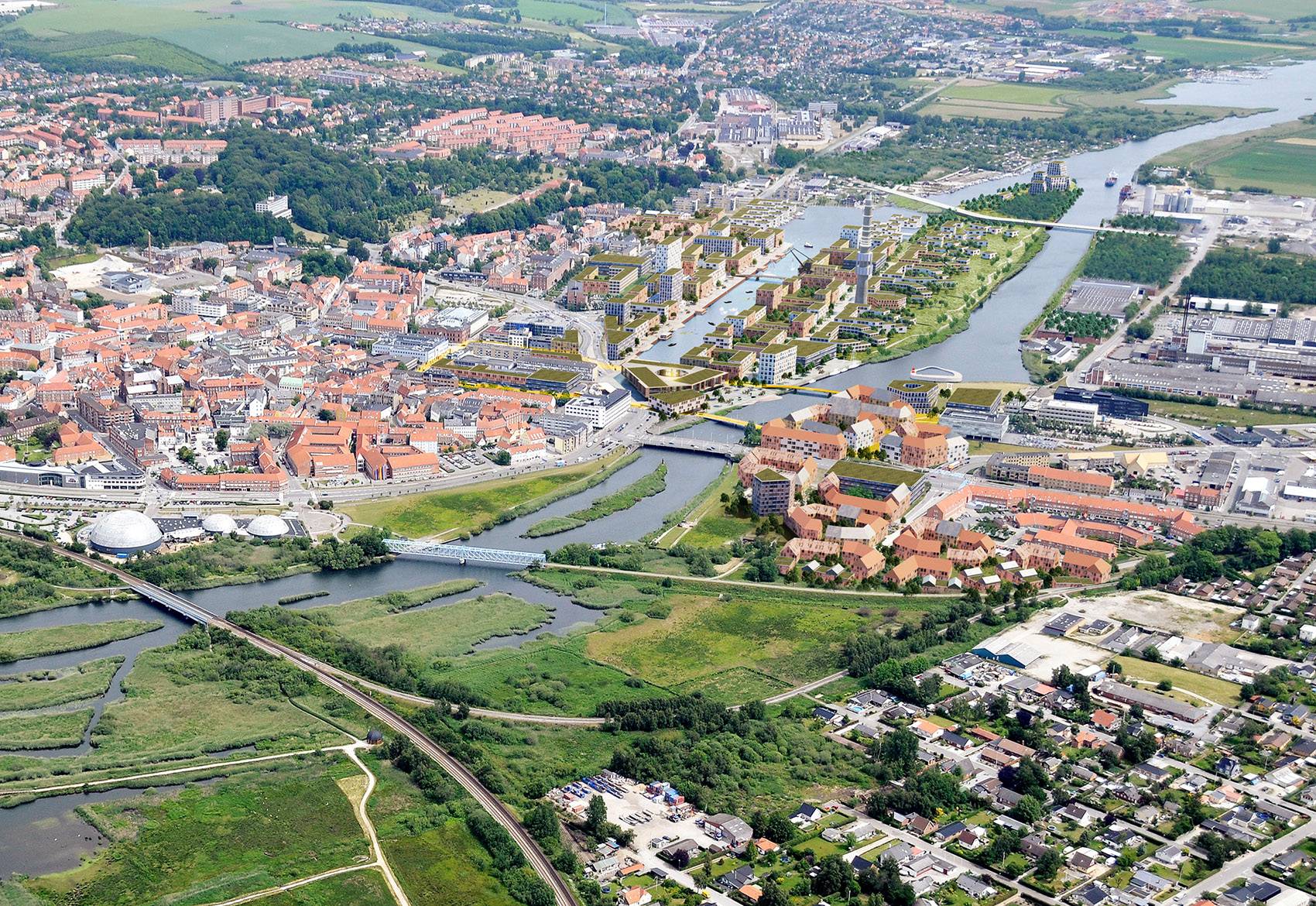 本競賽方案名為“我們的河濱小鎮(zhèn)”,通過將蘭德斯的未來城市發(fā)展與環(huán)境結(jié)合在一起,打造出一個(gè)獨(dú)一無二的傍水而生的小鎮(zhèn)。蘭德斯的未來發(fā)展(如自然棲息地和娛樂休閑空間的開發(fā)等)與河流密切相關(guān)。人們希望將城市的開發(fā)與Guden?河流聯(lián)系在一起,同時(shí)注重自然的可持續(xù)和氣候的變化及其應(yīng)對(duì)措施,將蘭德斯打造為一個(gè)面向未來的創(chuàng)新型城市。