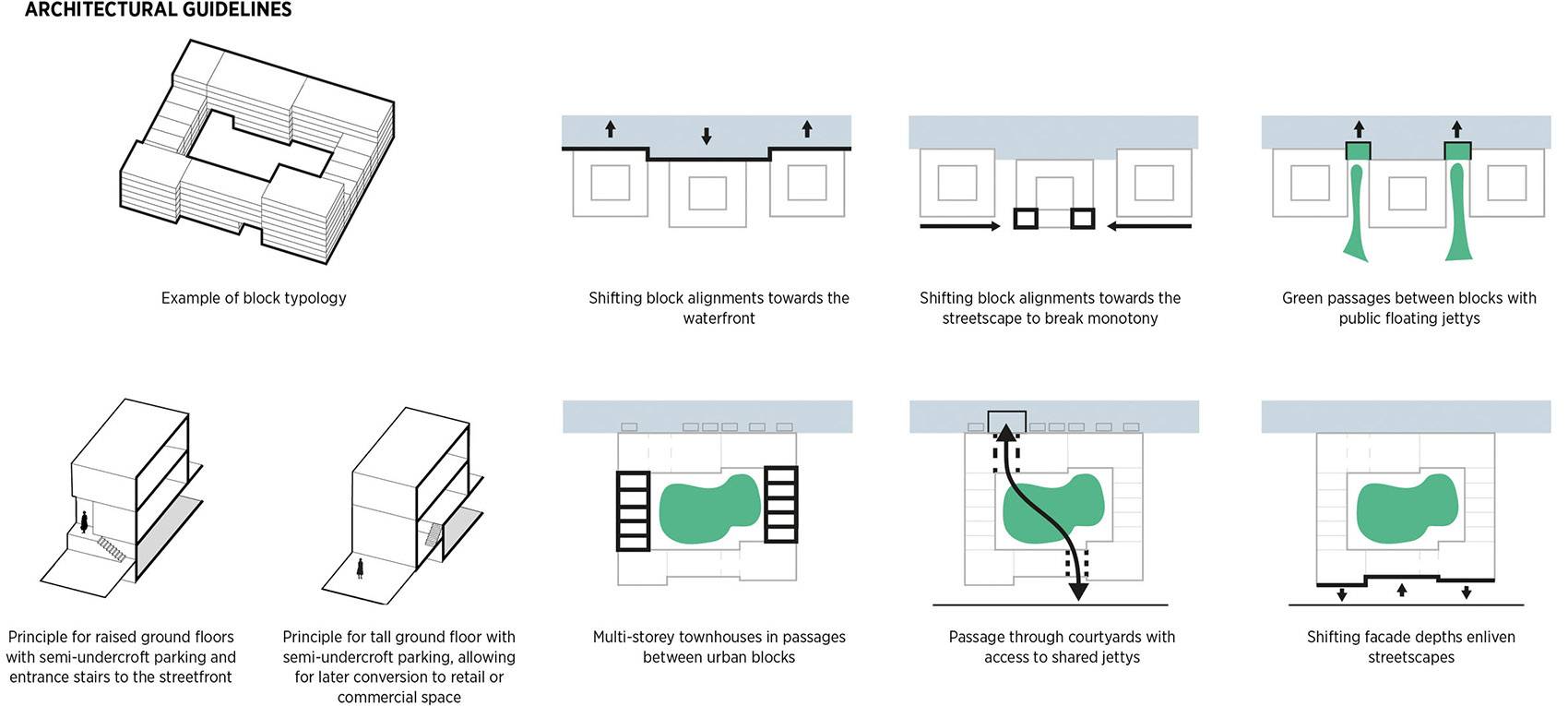 ▼新街區(qū)內(nèi)的建筑形式構(gòu)想 – 圍合式建筑:順著河岸設(shè)置圍合式建筑,在其中設(shè)置庭院,在其間設(shè)置綠色走廊