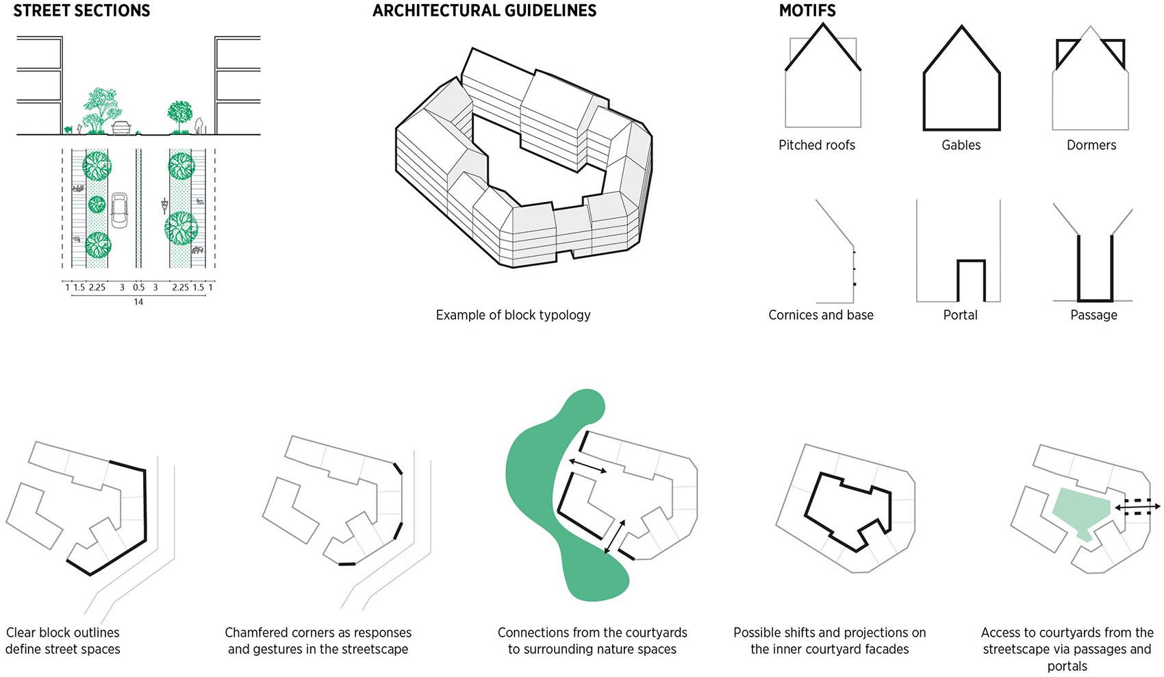 ▼新街區(qū)內(nèi)的建筑形式構(gòu)想 – 坡屋頂造型的圍合式建筑:沿著城市道路設(shè)置坡屋頂造型的圍合式建筑