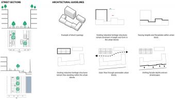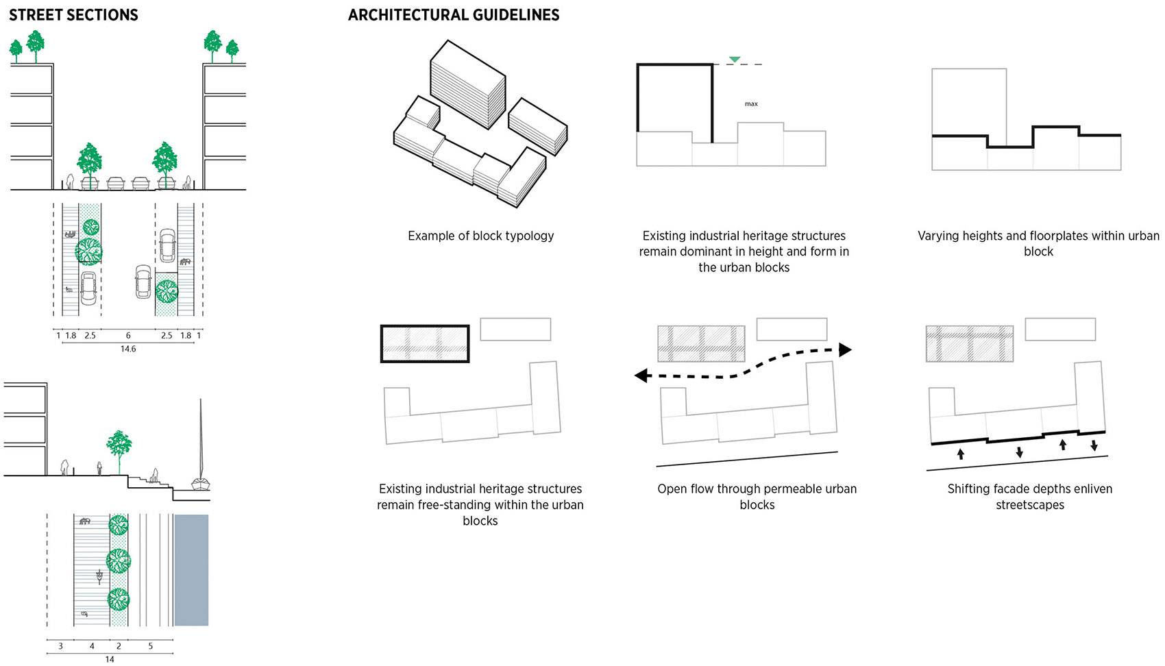 ▼新街區(qū)內(nèi)的建筑形式構(gòu)想 – 通過現(xiàn)存工業(yè)建筑形成內(nèi)街和區(qū)域天際線:工業(yè)建筑獨(dú)立存在,并在形式和建筑高度上在街區(qū)內(nèi)占據(jù)主導(dǎo)位置,與新建建筑共同構(gòu)成內(nèi)街;通過設(shè)計(jì)新建建筑的立面來形成城市的街景立面