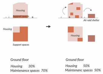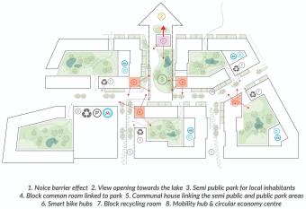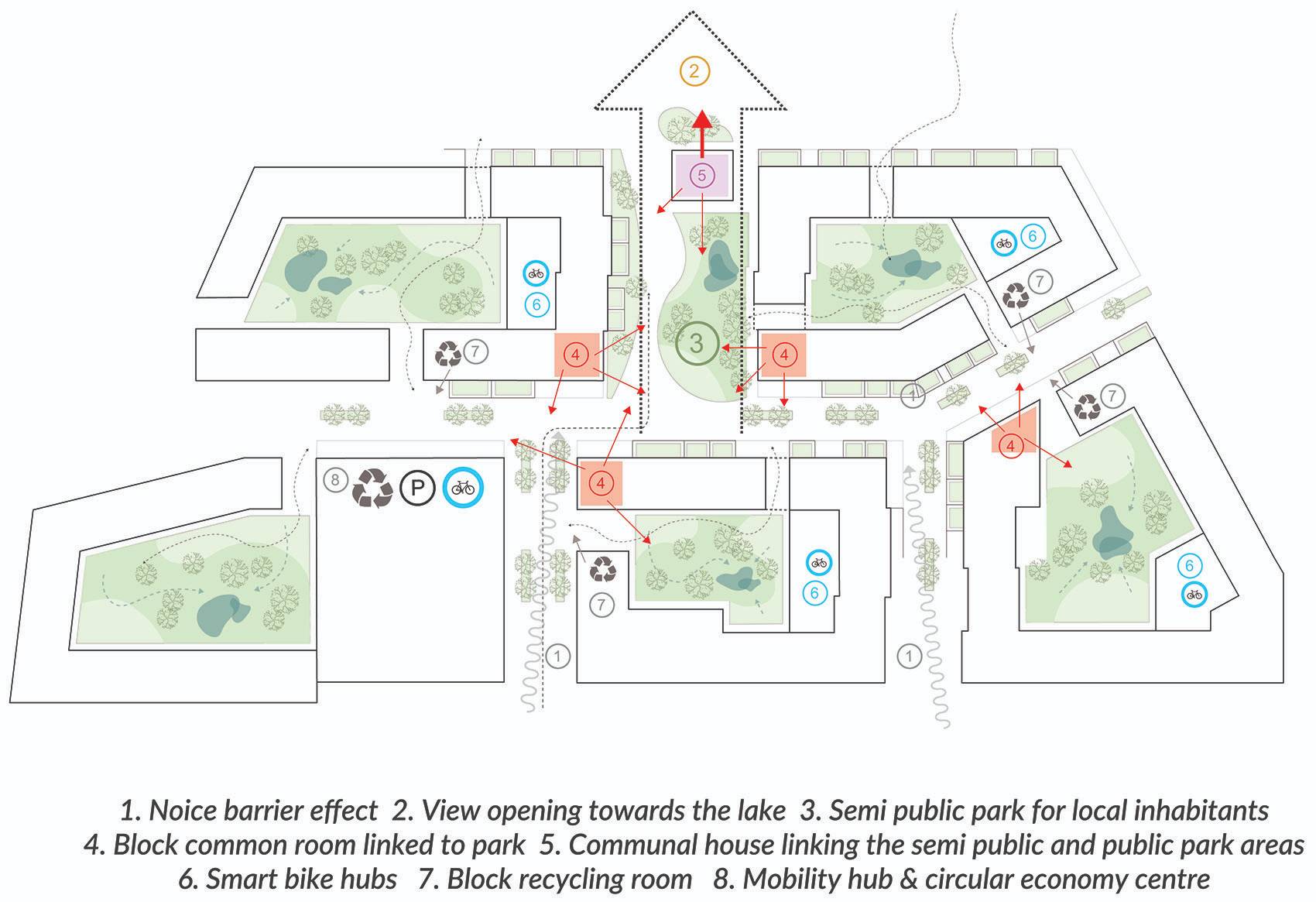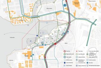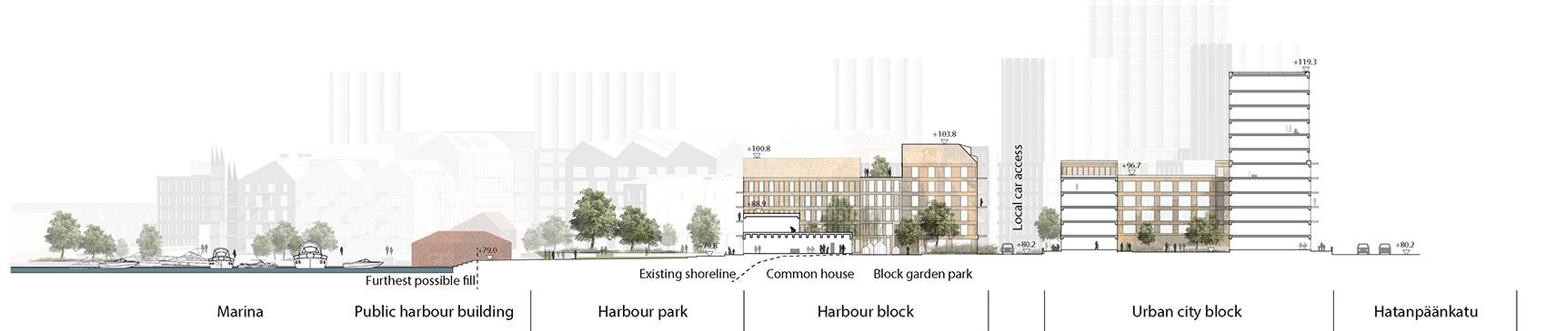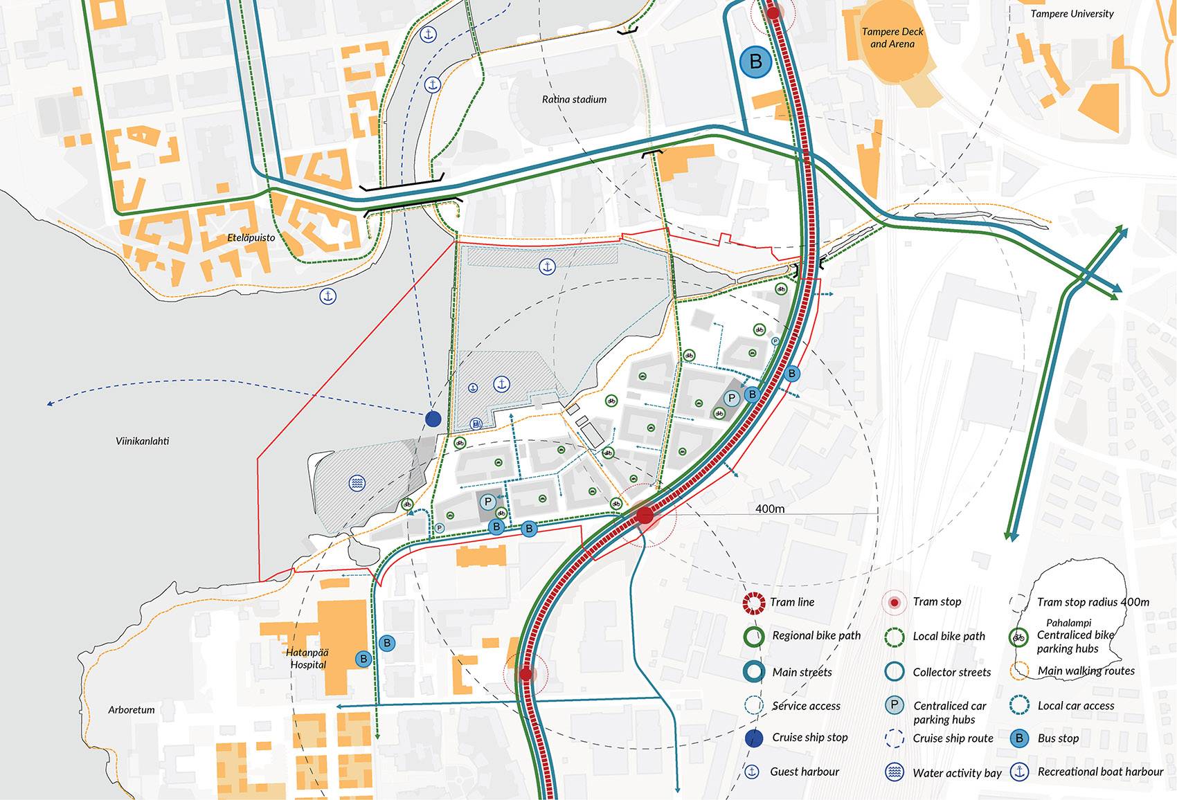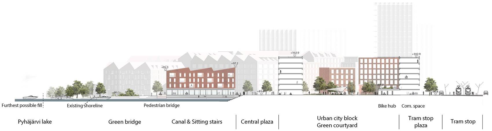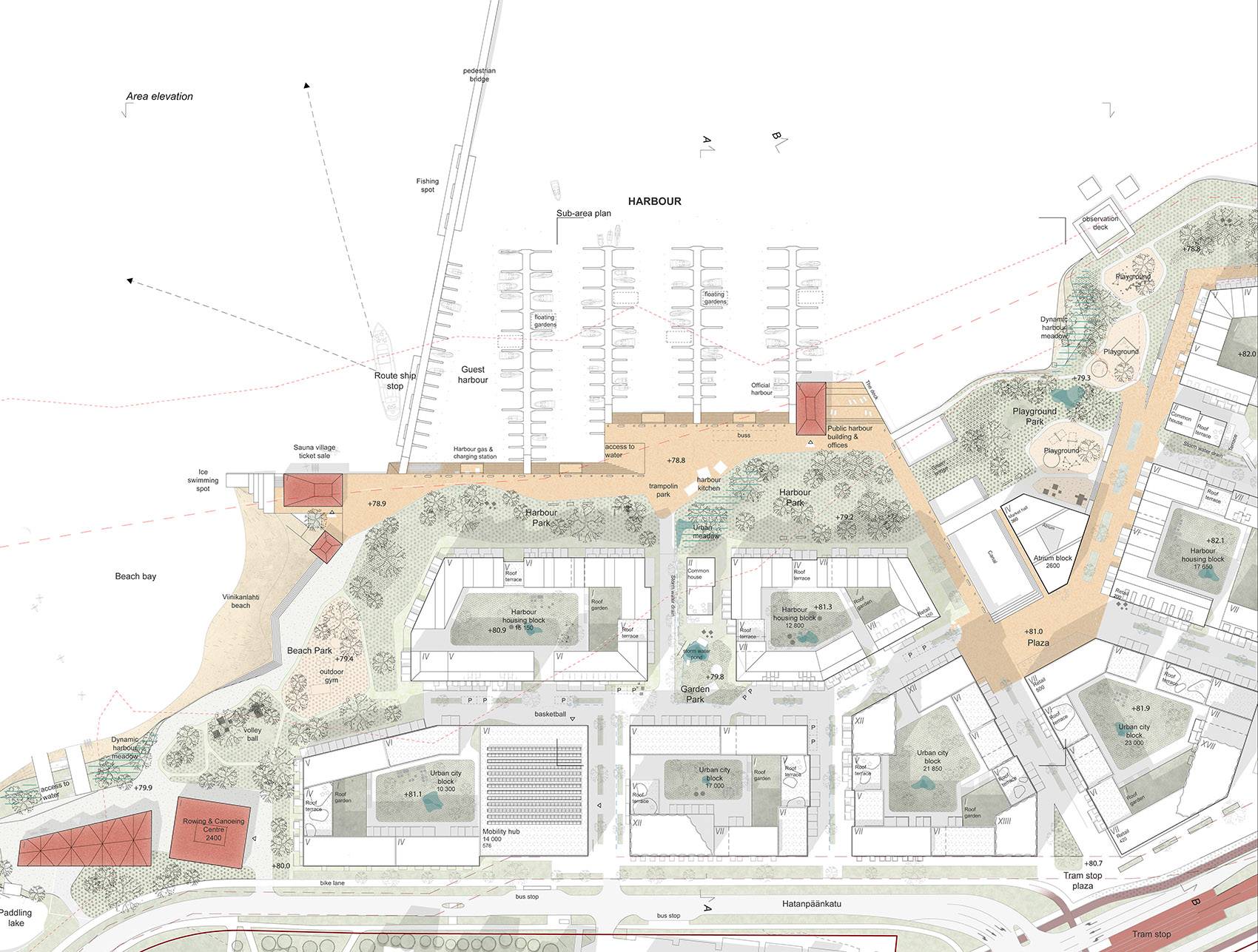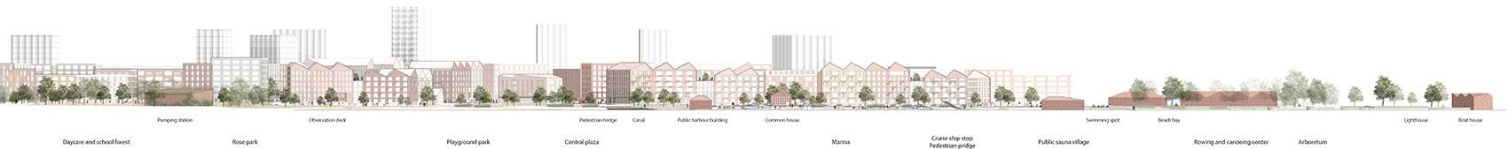 以公共交通為基礎(chǔ)來進(jìn)行城市的結(jié)構(gòu)設(shè)計(jì)。城市的交通體系集中在Hatanp??高速公路和電車沿線附近,形成了一個(gè)骨架般的高密度市中心區(qū)域。隨后,新的城市結(jié)構(gòu)向周邊擴(kuò)張,一直延伸到新建人行天橋與海岸線的交匯點(diǎn)。