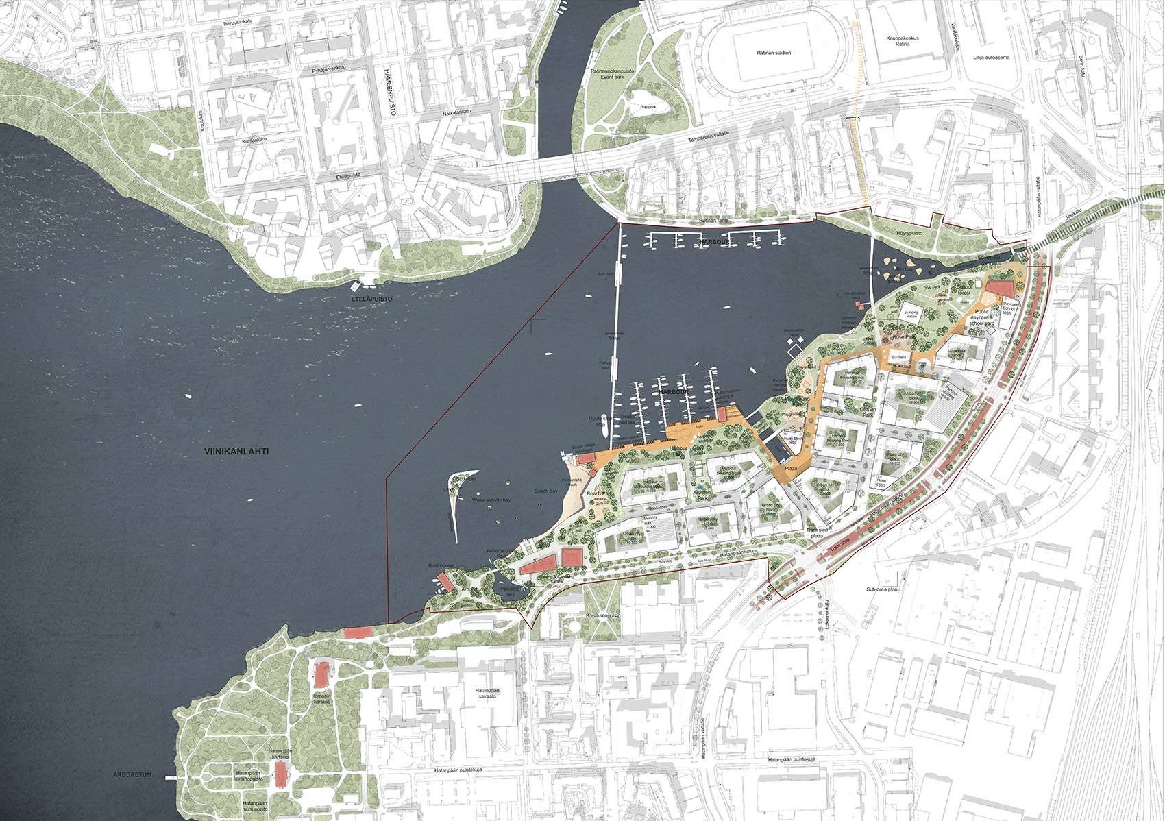 ▲1:2000總平面圖,Viinikanlahti新區(qū)位于海岸線上