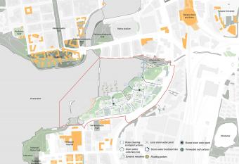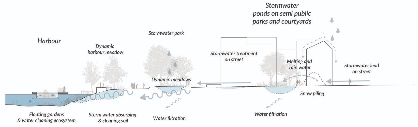 此外,該總體規(guī)劃還設(shè)置了雨水處理系統(tǒng),并將其作為了景觀設(shè)計(jì)的基礎(chǔ)。最終,一系列分散在Viinikanlahti新區(qū)中的雨水處理單元通過硬連線的方式,形成了一個(gè)無縫銜接的天然水處理系統(tǒng)。