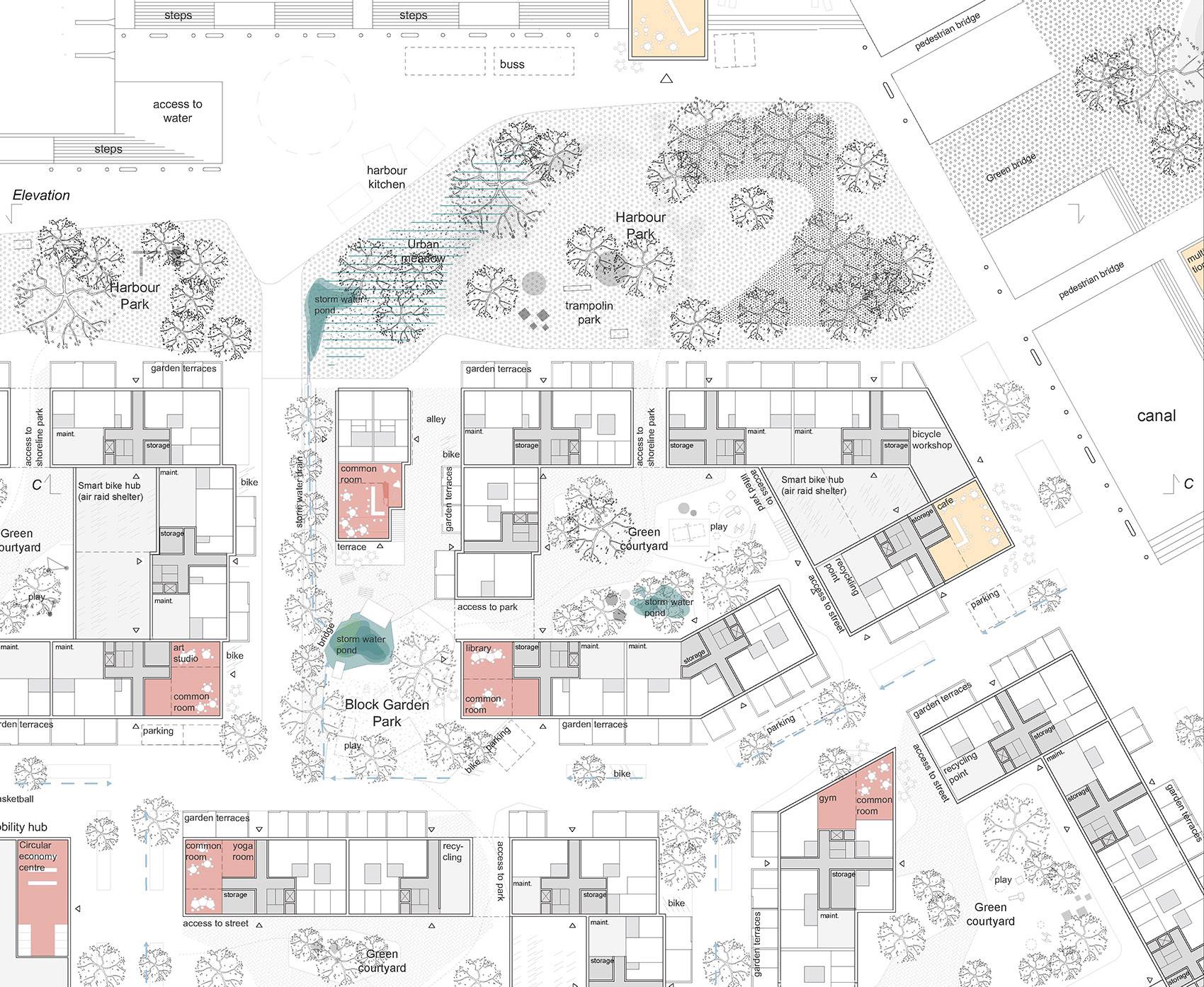 ▲1:1000總平面圖,將市中心的住房和各項(xiàng)服務(wù)設(shè)施向南側(cè)海岸線延伸