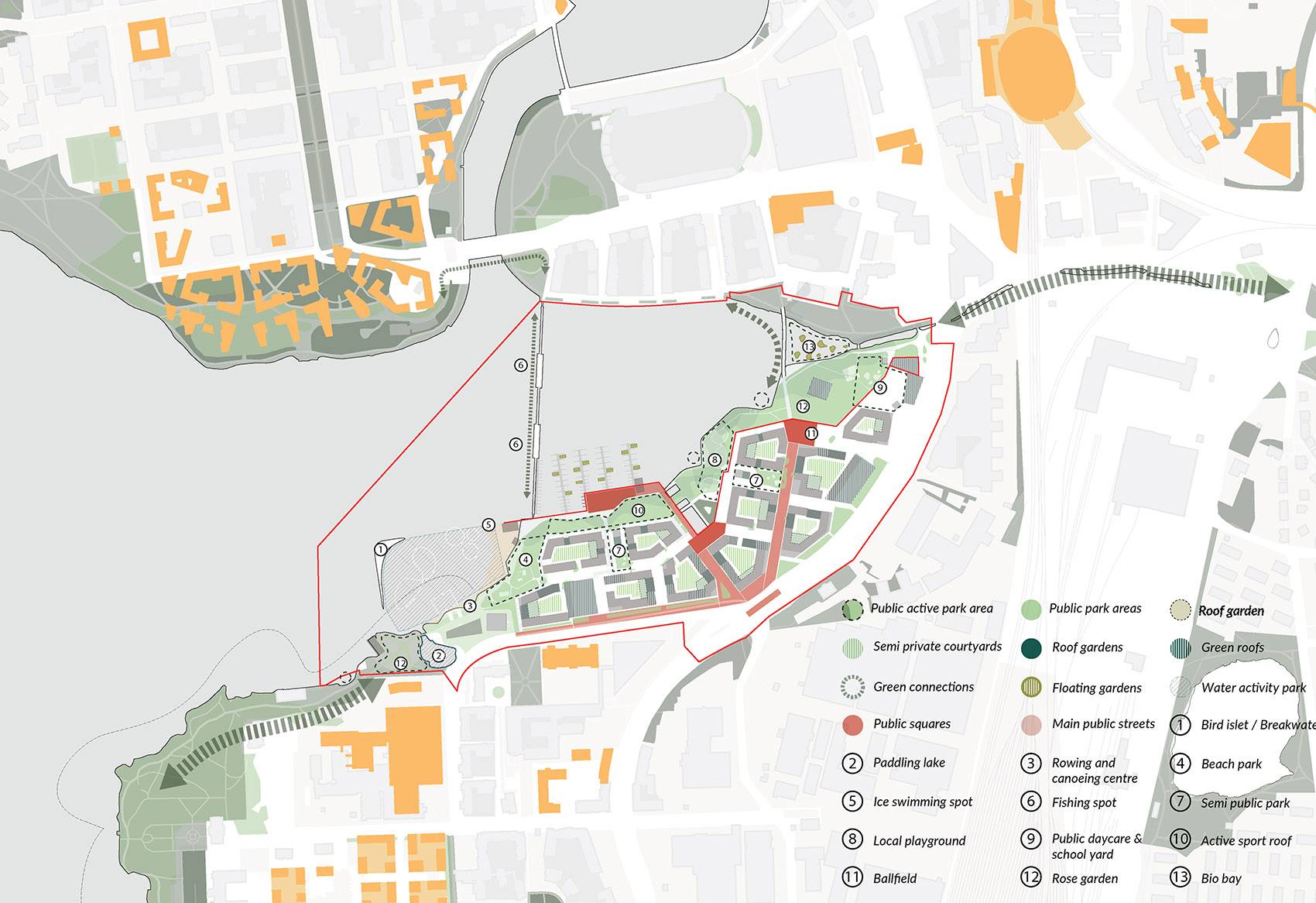 1.設(shè)計(jì)強(qiáng)調(diào)了坦佩雷原有城市結(jié)構(gòu)中的水路空間。在變化多樣的海岸線的配合下,無論是生活區(qū)、公共廣場、還是城市結(jié)構(gòu)中的水體,都具有極強(qiáng)的存在感。