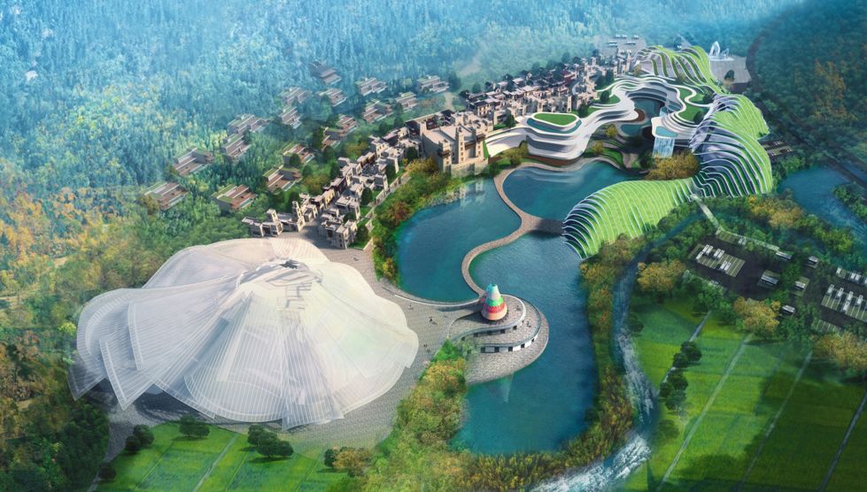 通過(guò)對(duì)場(chǎng)地的思考,將空間分為點(diǎn)、序、引三個(gè)界面。由“飄逸動(dòng)感,連綿起伏,山水詩(shī)意”的山谷建筑,再穿越異域風(fēng)情的九轉(zhuǎn)寨子,直到氣勢(shì)恢弘的劇院和祈福塔,聯(lián)通旅游業(yè)態(tài),凝萃文化精髓。