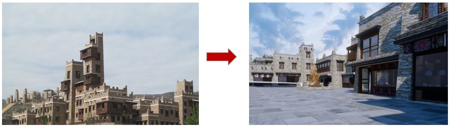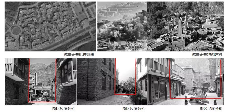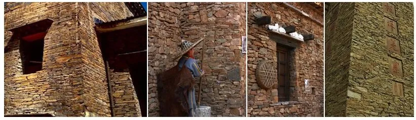 羌寨就地取材,碉樓村寨用頁(yè)巖片石等壘砌,汲取特色,延續(xù)羌族特色建筑外立面上采用片石、塊石、原木,色彩以片石材質(zhì)的淺褐灰與泥土黃為主。