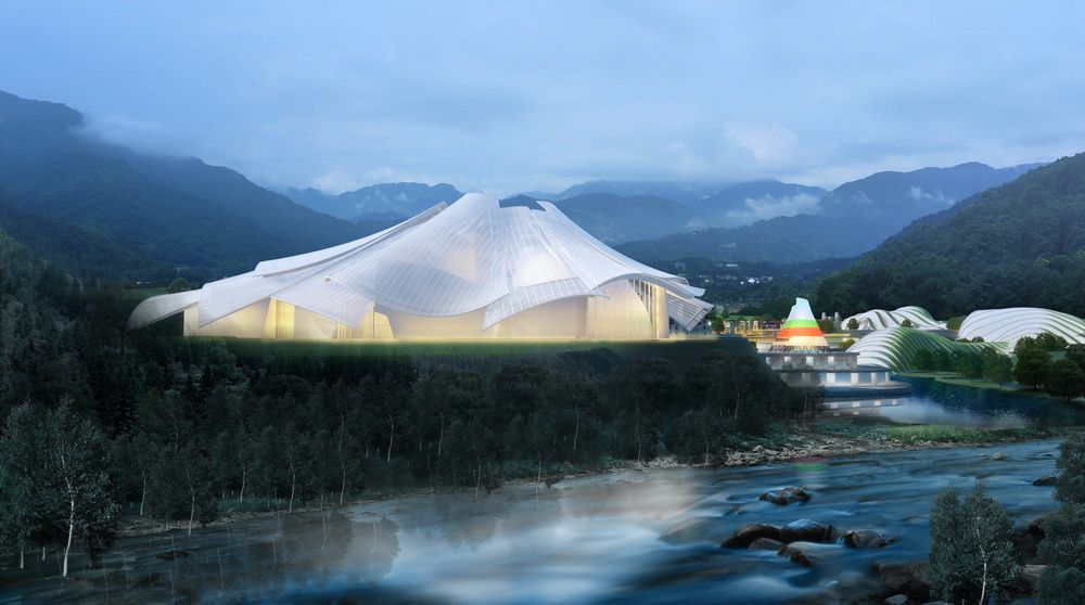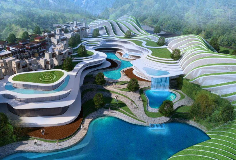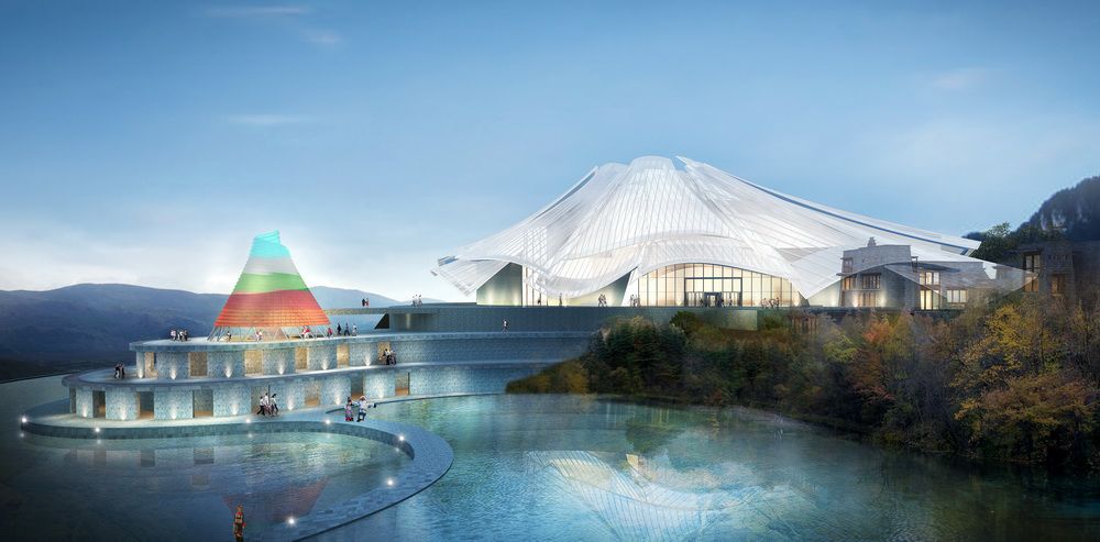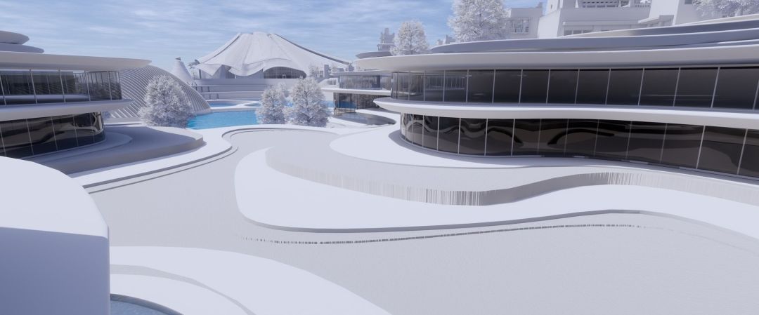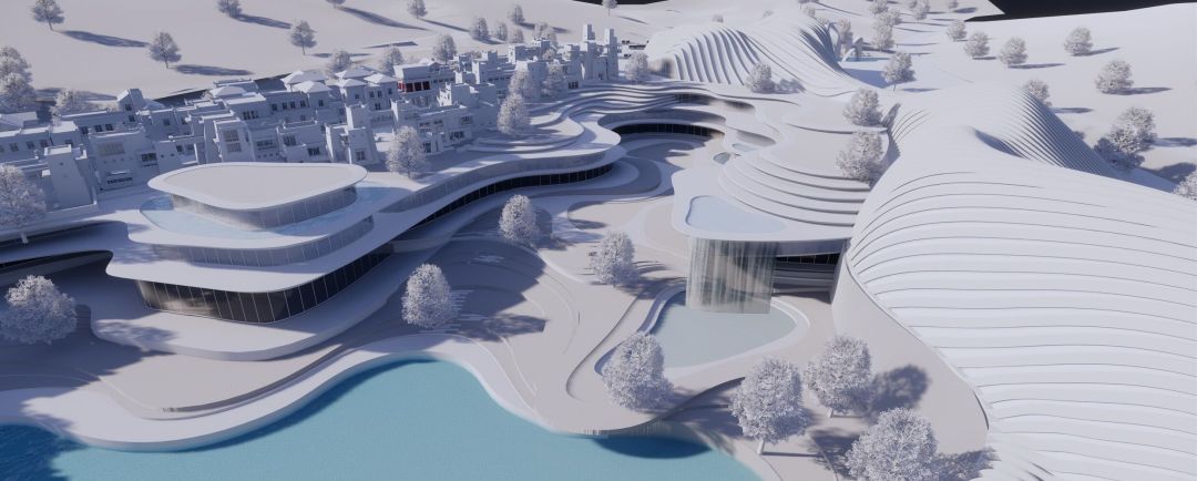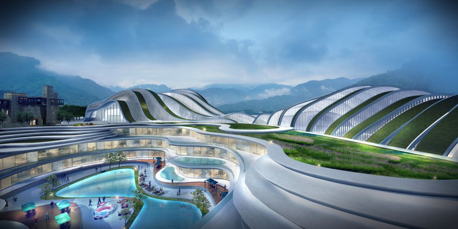 酒店與購(gòu)物體驗(yàn)中心、藥泉養(yǎng)生中心等形態(tài)連接,交通互通,各個(gè)區(qū)域觀察入口建筑都驚嘆山水奇觀。
