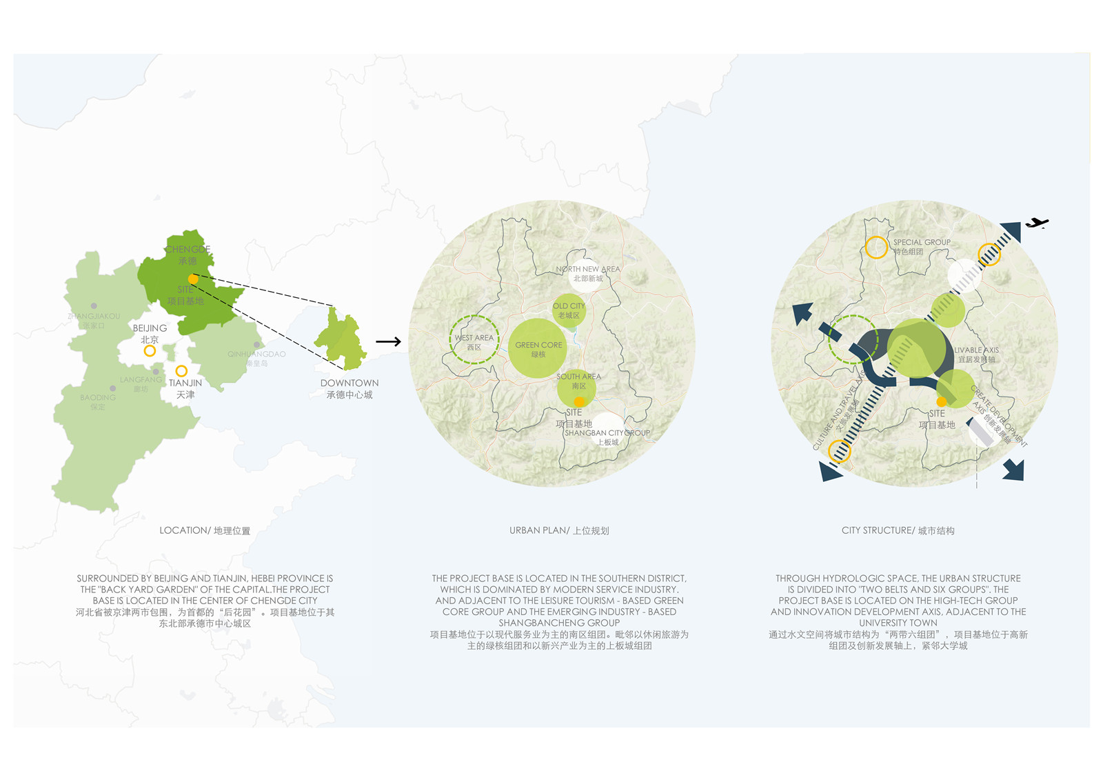 Surrounded by Beijing andtianjin, hebei province is the “back yard garden” of the capital. The project base is located in the center of Chengde city. The project base is 230 kilometers away from Beijing (about 2.5 hours drive) and 300 kilometers away from Tianjin (about 3 hours drive). The new airport service between Shanghai, Hong Kong and south China offers the possibility to expand the southern market. The project base is located in the axis of the city’s historical features, advantaged historical context location, and continues the summer resortvacation lifestyle.