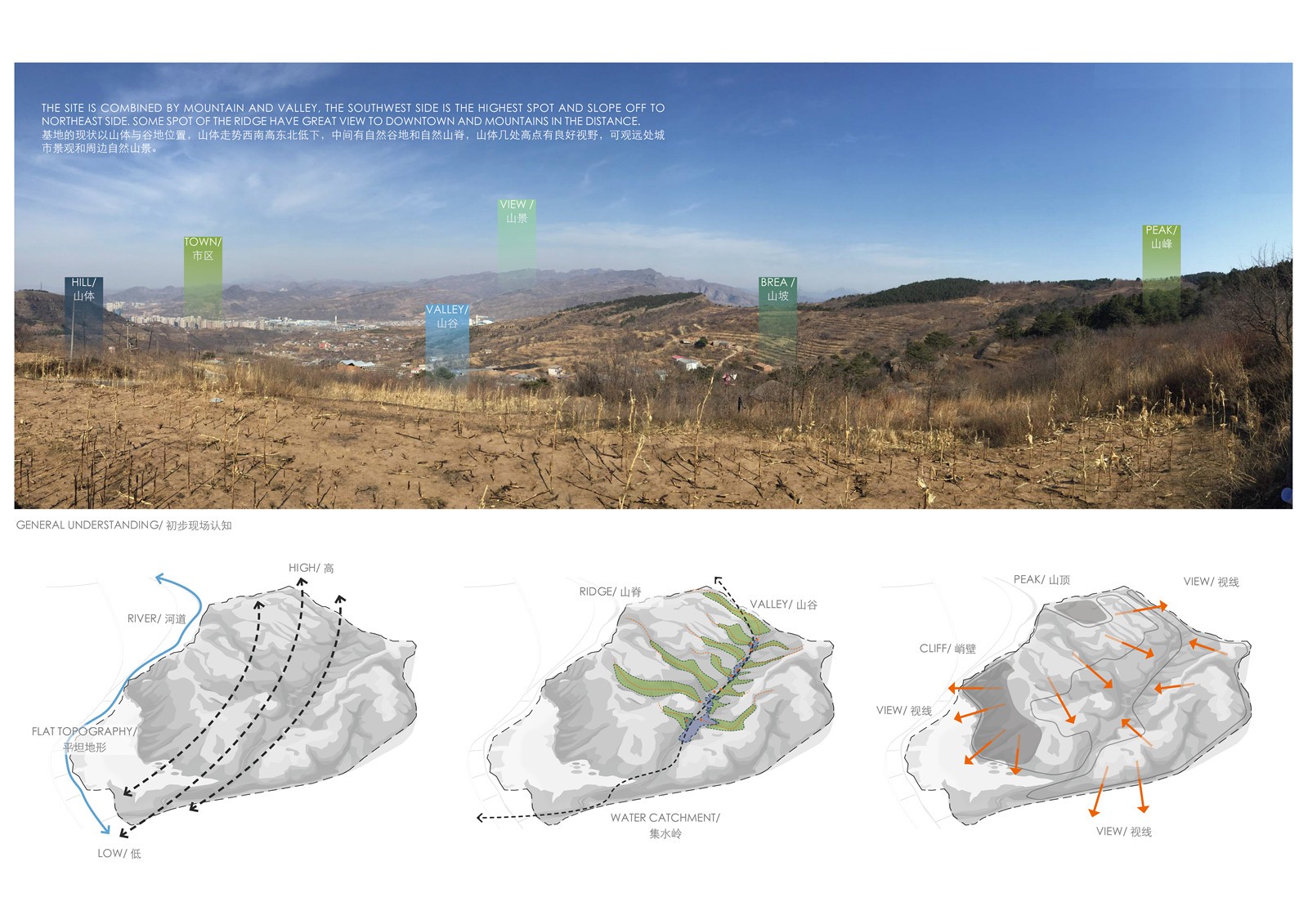 基地的現(xiàn)狀以山體與谷地位置,山體走勢西南高東北低下,中間有自然谷地和自然山脊,山體幾處高點(diǎn)有良好視野,可觀遠(yuǎn)處城市景觀和周邊自然山景。