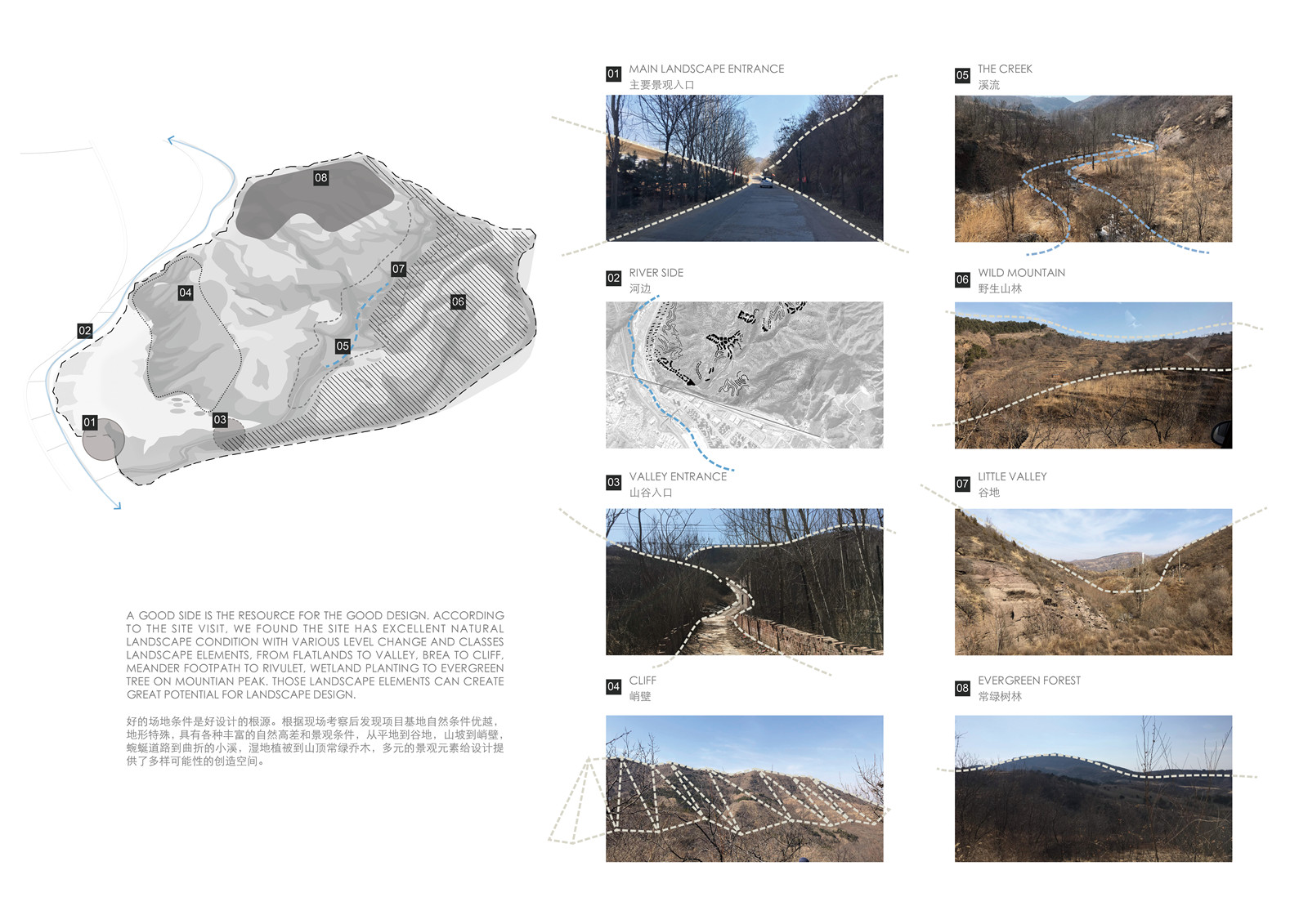 A good side is the resource for the gooddesign. According to the site visit, we found the site has excellent naturallandscape condition with various level change and classes landscape elements,from flatlands to valley, brea to cliff, meander footpath to rivulet, wetlandplanting to evergreen tree on mountian peak. Those landscape elements cancreate great potential for landscape design.