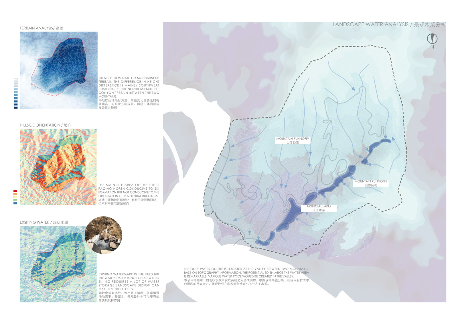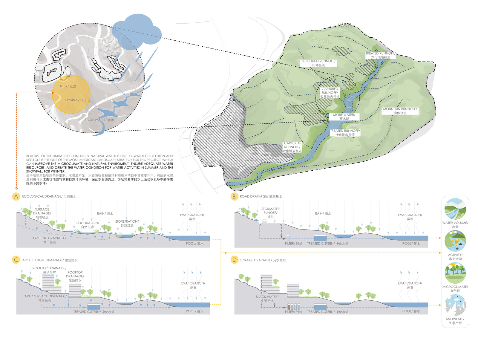 Beacuse of the limitation condition, natural water is limited. Water collection andrecycle is the one of the most important landscape strategy for this project, which can improve the microclimate and natural enviroment, ensure adequate water resources, and create the watercondition for water activities in summer and the snowfall for winnter.