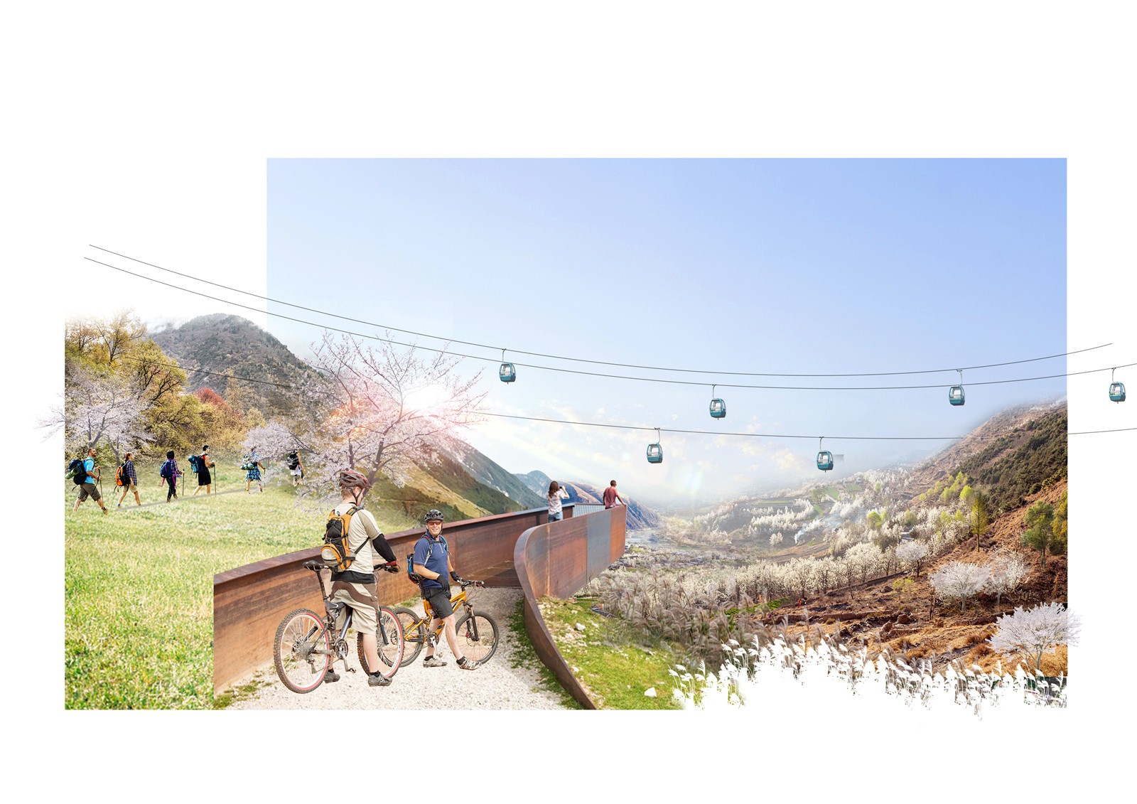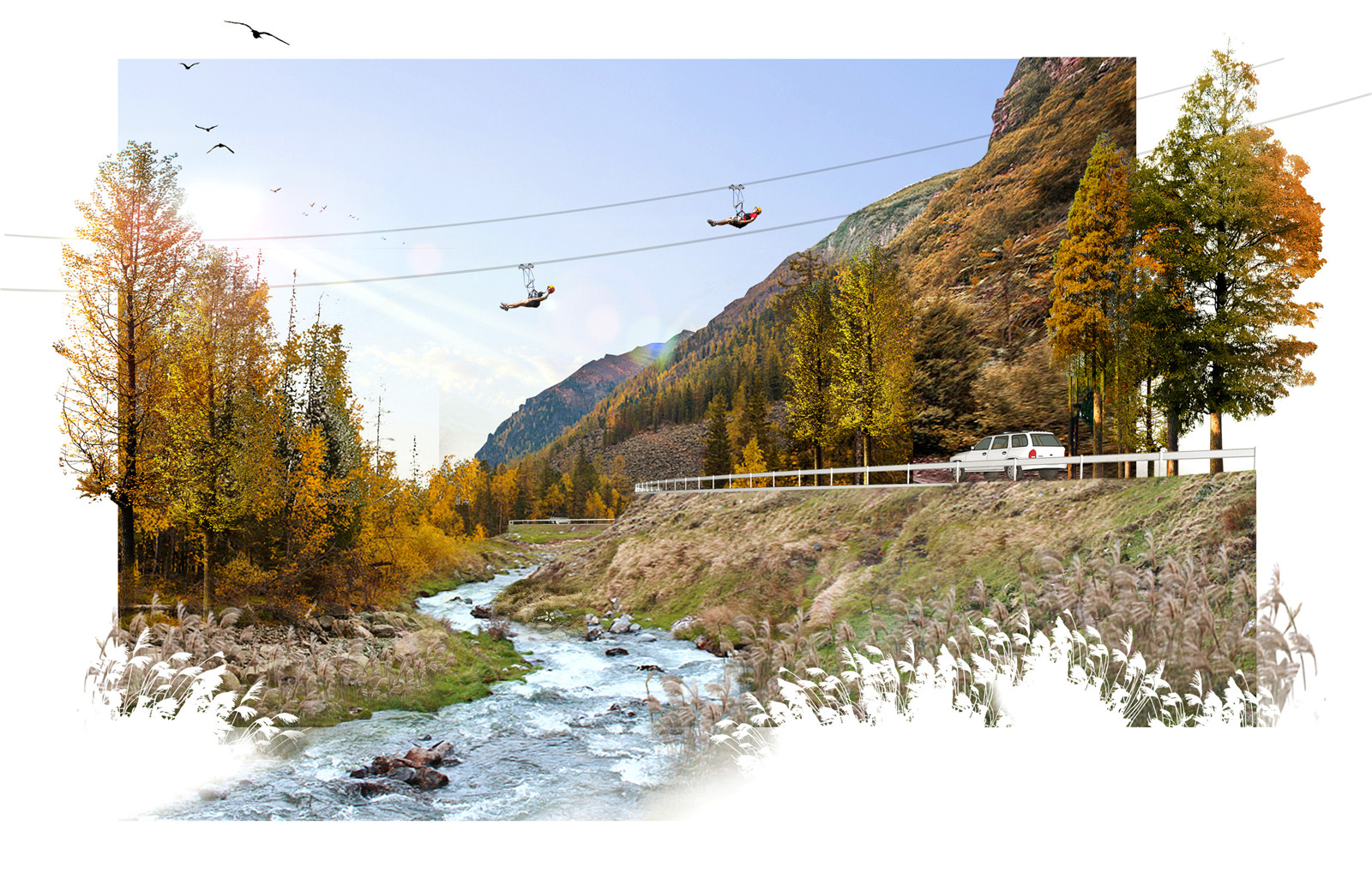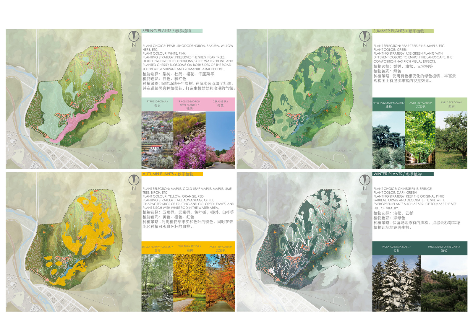 Seasonal change brings more opportunities for the landscape planning. Natural sceneryand seasonal activities are considered in landscape strategy, for instance, people can admire the beauty of flowers in spring, have water activities during summer, hiking in fall and skiing in winter. The landscape way is used to bringpeople cross the attractive valley.
