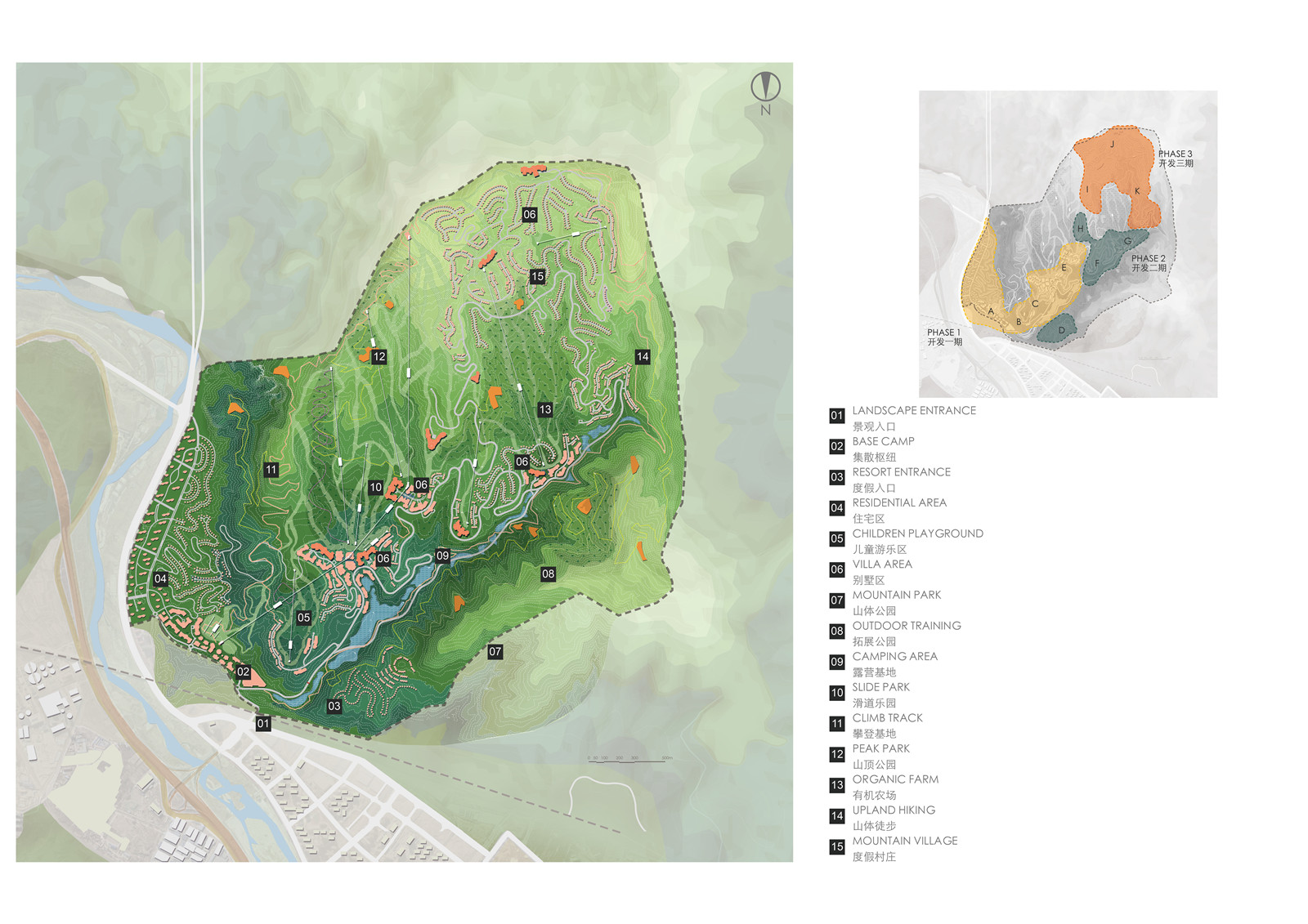 The resort for four seasons, all day and all ages is the priority character for this project. Chengde has natural conditions and feature attractions with traditional local characteristic. Three natural elements “tree” “water” “stone” is pushed out by means of the analysis from site information, to remind the needs and attention for the importance of the high quality natural environmentin resort, and uses three different angles to transform the elements tolandscape design.