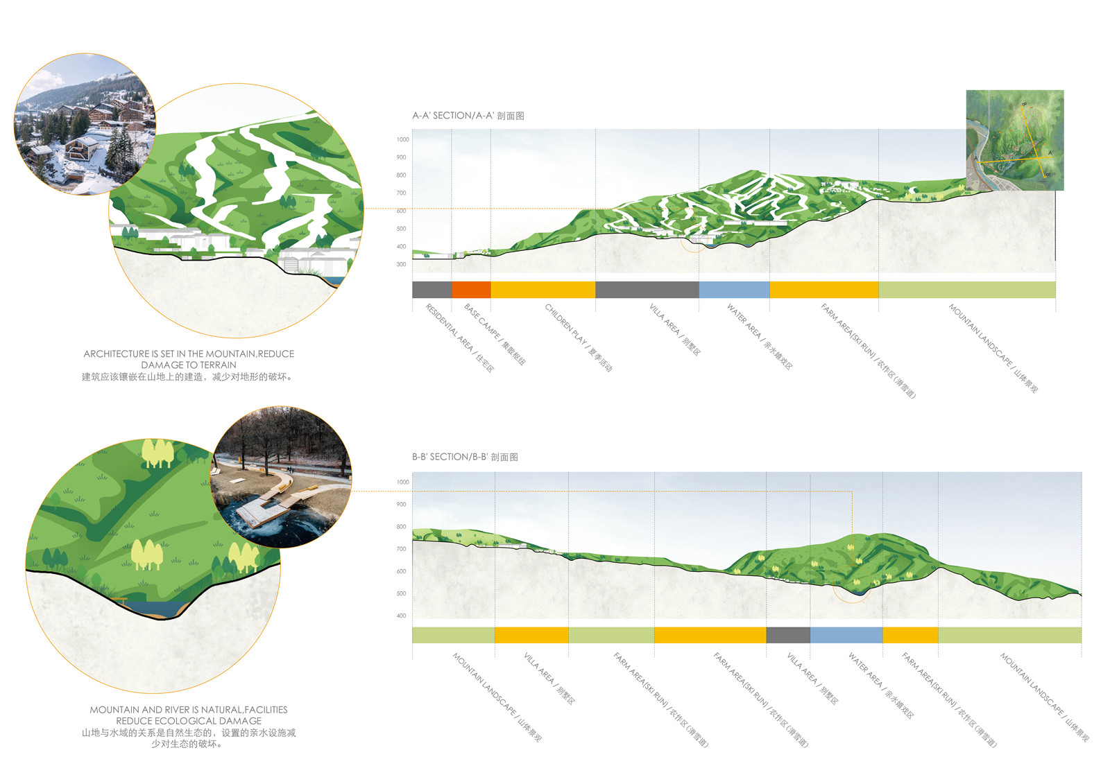 The another important aspect is ecological protection. In order to keep the advantageous natural conditions, some eco-way for landscape design is proposed, such as have more plants, using environment-friendlymaterial, keep the mountain structure and have the efficient water recycle system to insure the sustainable development for resort.