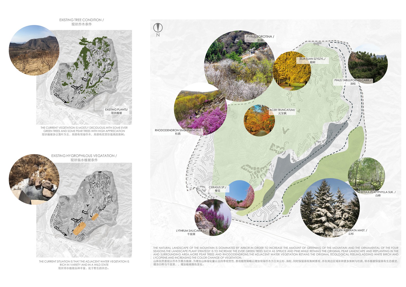山體自然景觀以喬木為重點(diǎn)植被,為增加山體綠化量以及四季觀賞性,景觀植物策略以增加常綠喬木為主如云杉,油松,同時保留原有梨樹景觀,并在周邊區(qū)域補(bǔ)種更多梨樹與杜鵑,鄰水植被保留原有生態(tài)感覺,增添白樺等植被,增加植被顏色變化。