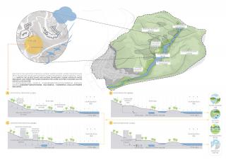 ALSA adopt four different water collection methods in the planning, which are ecological water collection, road water collection, building water collection and sewage water collection. Ecological drainage, road drainageand building water catchment are all based on natural rainwater as the source of water. In ecological drainage water flows through surface run off and underground run off to the depression that we have planned to meet ecological filtration at different heights on the hillside. Road drainage is the way for underground filtration and purification of rainwater collected by drainage channels on both sides of the road. For collecting water in buildings, it is necessary to meet the water ecological design during the architectural design, such as collecting water through green roof and orderly drainage system, and finally all water will flow to the planned storage area in an orderly manner for recycling. In addition, the sewage produced by the lock in the site can also be used as an important circulating water source.
