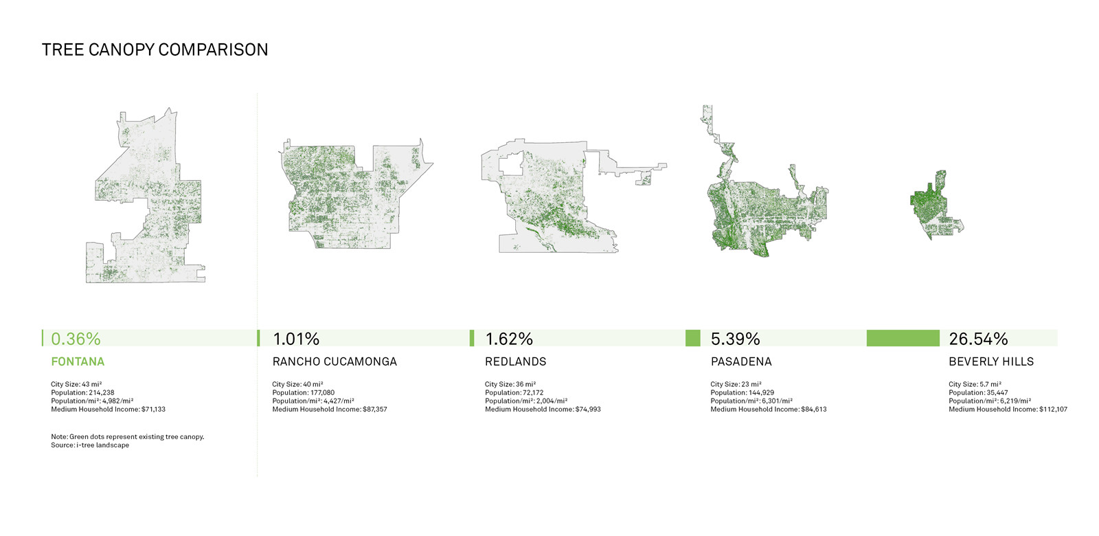 Landlocked within California’s semi-arid Inland Empire, residents of Fontana are exposed to air quality that is worse than 95% of census tracts in California. Its urban forest – a mere 0.36% coverage – is distinctly less than other communities in Los Angeles Basin. This statistic, when considered with the influence of major transportation corridors, notable industrial hubs, frequent regional wildfires, and projected population growth, is at further risk as outdated and unconsolidated landscape regulations face increased development pressures.