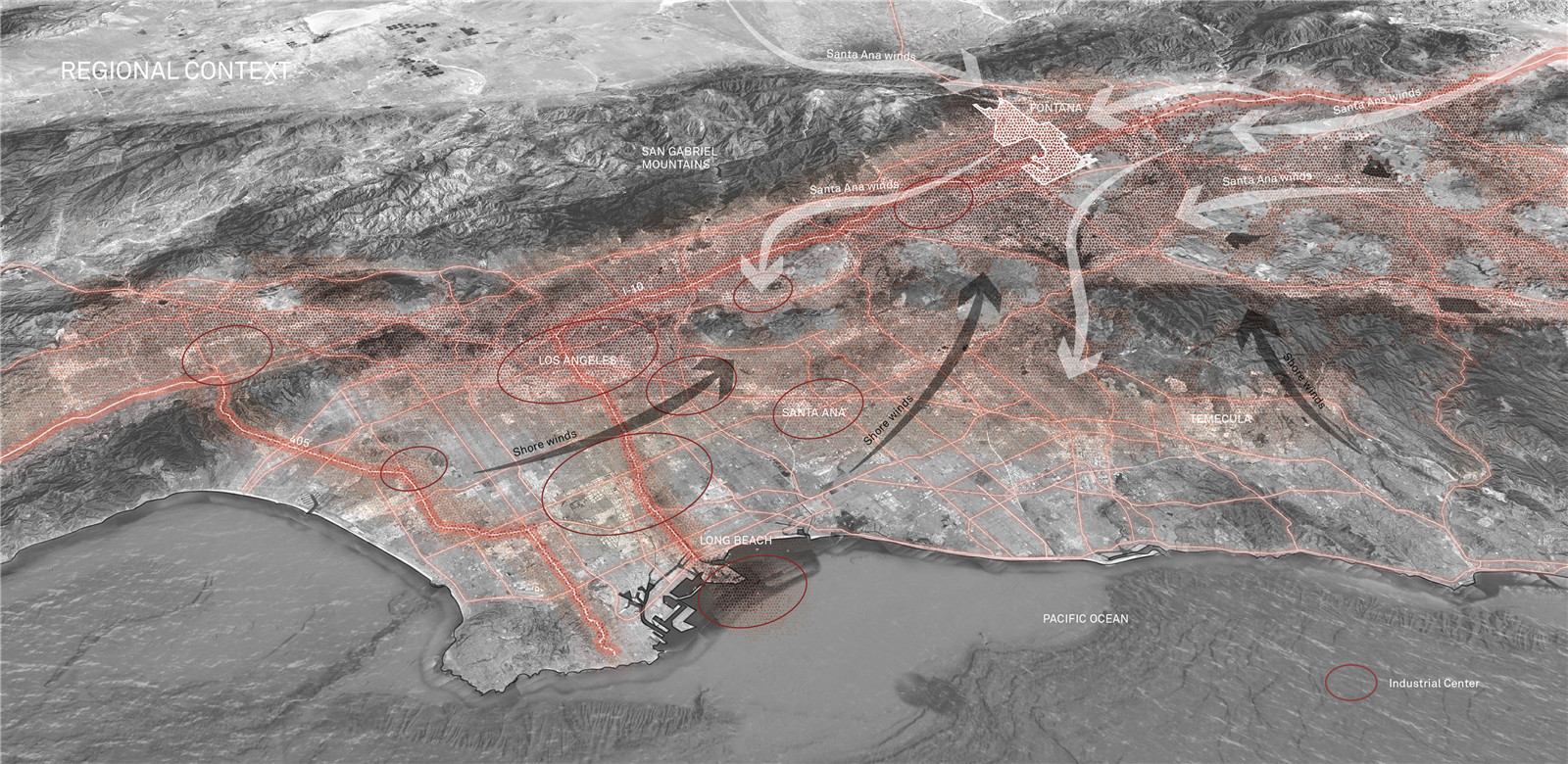 方塔納市位于美國(guó)加利福尼亞州內(nèi)陸半干旱地區(qū),居住環(huán)境空氣質(zhì)量要劣于加州95%的人口普查區(qū)。另外,方塔納的森林覆蓋率僅0.36%,明顯低于洛杉磯盆地的其他城市。這些統(tǒng)計(jì)數(shù)據(jù)可能預(yù)示著更大的風(fēng)險(xiǎn),因?yàn)樵撌朽徑饕煌ɡ鹊篮椭匾I(yè)中心,頻繁發(fā)生區(qū)域野火,且預(yù)計(jì)人口將持續(xù)增長(zhǎng),然而其景觀規(guī)劃卻過時(shí)而松散,難以應(yīng)對(duì)發(fā)展壓力。