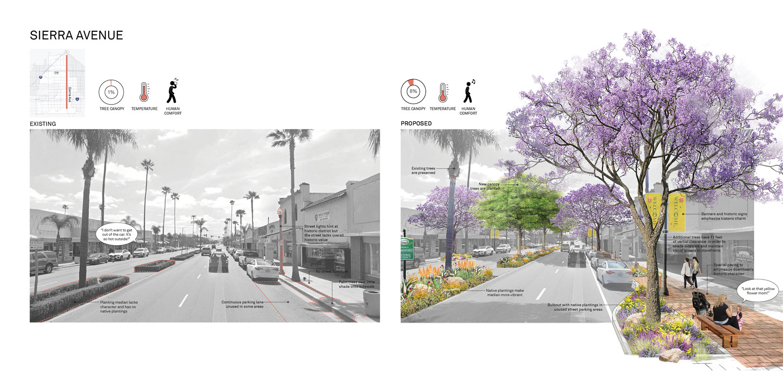 Recognizing these statistics, the City of Fontana and The Southern California Association of Governments (SCAG) commissioned the landscape architect to craft an Urban Greening Master Plan to increase citywide tree canopy, improve multi-modal mobility, catalyze economic development, consolidate various regulations, and update policies to improve visual character, conserve water and reduce maintenance. Beyond such goals, the landscape architect elevated the project’s purpose to explore how such a plan can directly improve air quality.