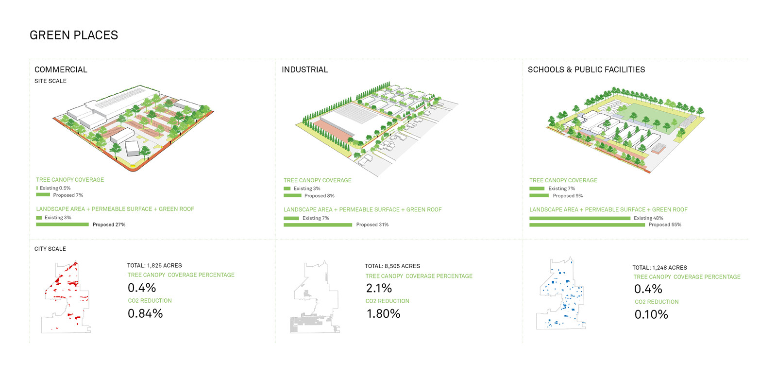 Taking the site-scale studies to a citywide scale, the Plan established a citywide - framework for future implementation. The framework incorporates green streets and green places. Green streets are composed of best scenarios of all street types, vegetated highways and gateways, achieving a connected green system. Green places include best scenarios of all land use typologies.
