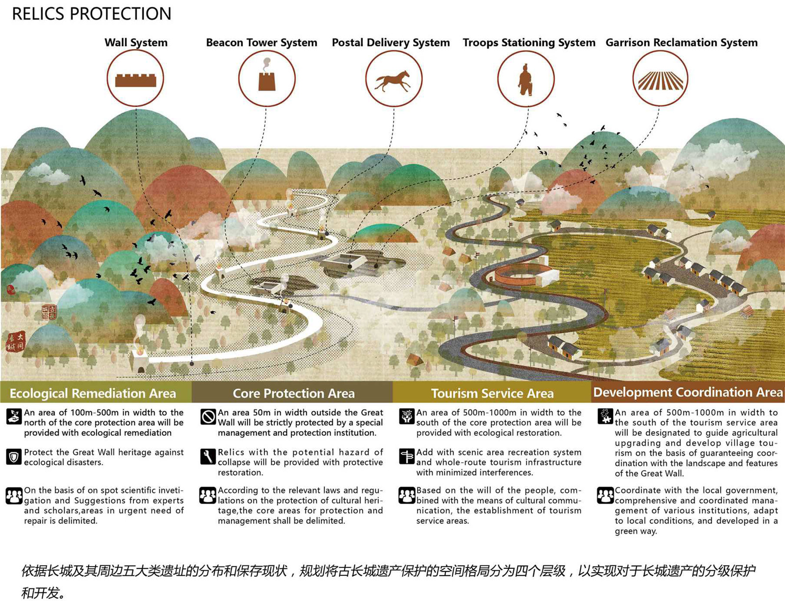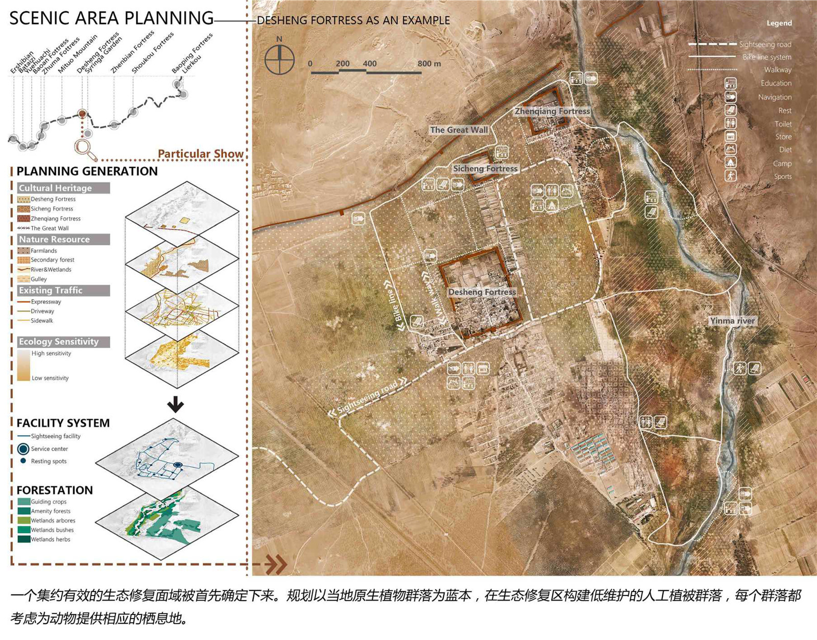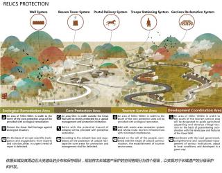 To protect the historical features of the Great Wall, the vegetation restoration and tourism facilities in the scenic areas have been carefully considered. Based on a comprehensive analysis on ecological sensitivity, relics distribution, building suitability and other elements, a set of minimum interference schemes is established.