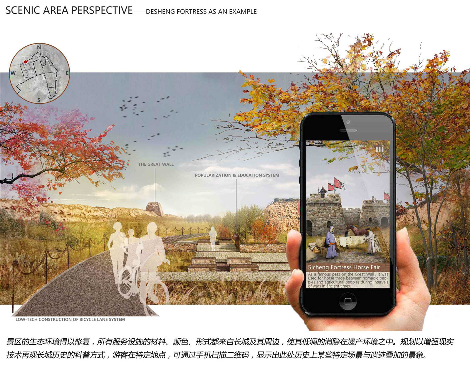 景區(qū)的生態(tài)環(huán)境將得以修復(fù),所有服務(wù)設(shè)施的材料、顏色、形式都來自長城及其周邊,使其低調(diào)的消隱在遺產(chǎn)環(huán)境之中。規(guī)劃以增強(qiáng)現(xiàn)實(shí)技術(shù)(AR)再現(xiàn)長城歷史的科普方式,游客在特定地點(diǎn),可通過手機(jī)掃描二維碼,顯示出此處歷史上某些特定場景與遺跡疊加的景象。