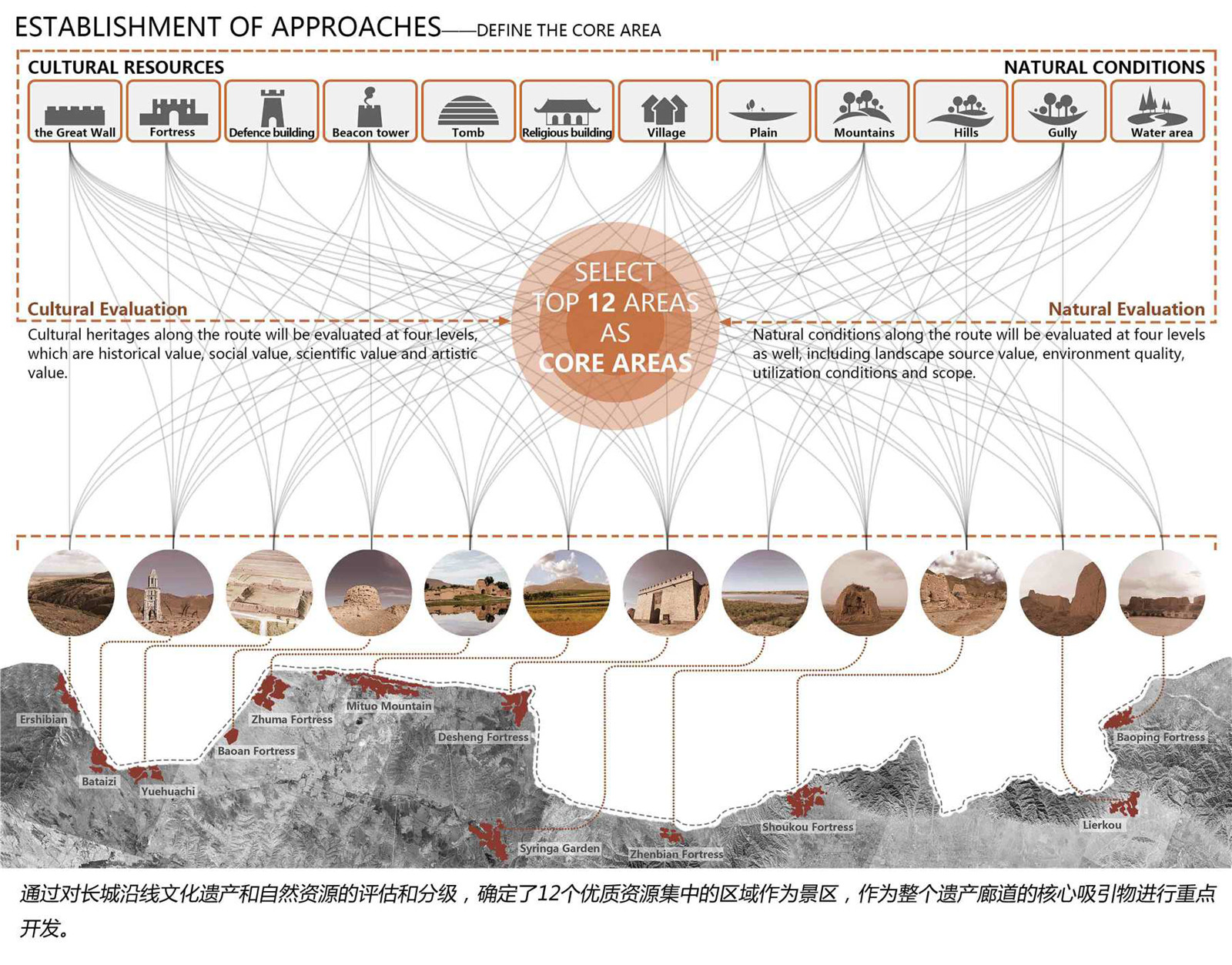 通過對(duì)長城沿線文化遺產(chǎn)和自然資源的評(píng)估和分級(jí),確定了12個(gè)優(yōu)質(zhì)資源集中的區(qū)域作為重點(diǎn)發(fā)展區(qū)域(景區(qū)),作為整個(gè)遺產(chǎn)廊道的核心吸引物進(jìn)行重點(diǎn)發(fā)展。
