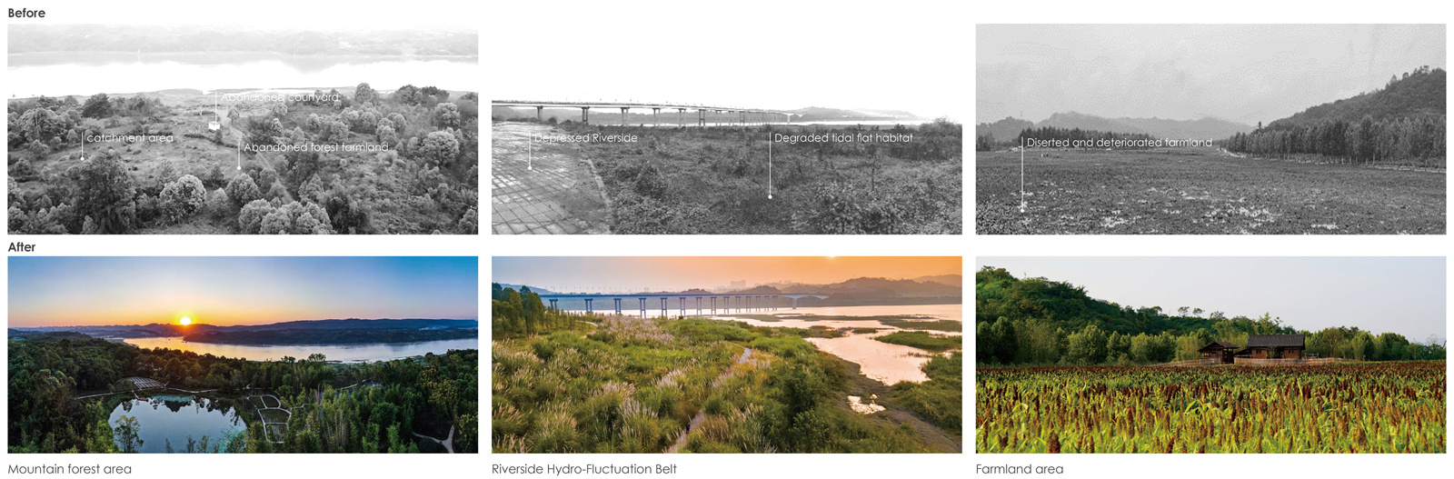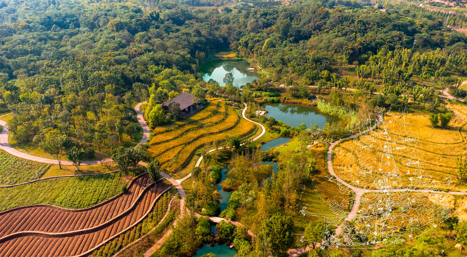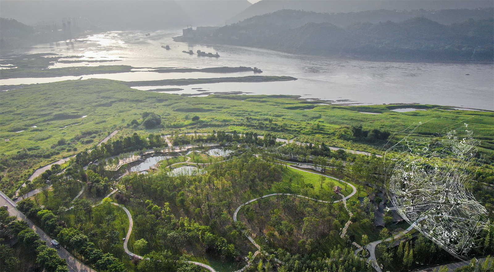 廣陽(yáng)島是長(zhǎng)江上游最大的江心島,大開(kāi)發(fā)前,這里曾經(jīng)是生物多樣性豐富、生態(tài)資源優(yōu)質(zhì)的巴渝綠島。步入大開(kāi)發(fā)時(shí)期,城市建設(shè)不斷推進(jìn),島內(nèi)原住民遷出,原始山林野化,水系、農(nóng)耕肌理退化。設(shè)計(jì)策略強(qiáng)調(diào)尊重自然本底與生態(tài)過(guò)程,重視巴渝本土文明與原鄉(xiāng)風(fēng)景營(yíng)建,在生態(tài)修復(fù)的過(guò)程中最大化保留生態(tài)過(guò)程的完整性,展現(xiàn)巴渝原鄉(xiāng)文明的原真性。如今,這座島歷經(jīng)蝶變,還原了本真自然的原鄉(xiāng)野境,提升了風(fēng)景服務(wù)于居民的功能,成為了長(zhǎng)江大河文明沿線上綠色發(fā)展的示范引領(lǐng)之地。