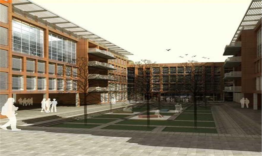 從校園空間體現(xiàn)社區(qū)(COMMUNITY)、交流(COMMUNICATION)、復(fù)雜性(COMPLEXITY)三大特點(diǎn)出發(fā),在規(guī)劃的空間格局的基礎(chǔ)上,通過(guò)建筑群體布局、道路交通系統(tǒng)設(shè)計(jì)形成一個(gè)肌理豐富的、多層次的校園公共空間體系---蛛網(wǎng)結(jié)構(gòu)(THE WEB)。校園公共空間體系具體體現(xiàn)為以下空間網(wǎng)絡(luò)的疊加:校園中心廣場(chǎng)——網(wǎng)絡(luò)核心,東西南北放射性軸線的公共空間序列,院落空間,室內(nèi)公共空間。